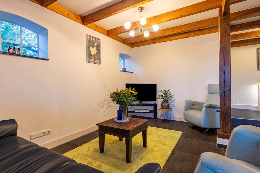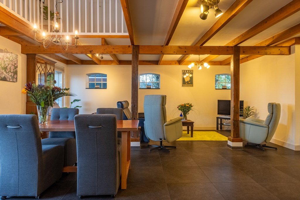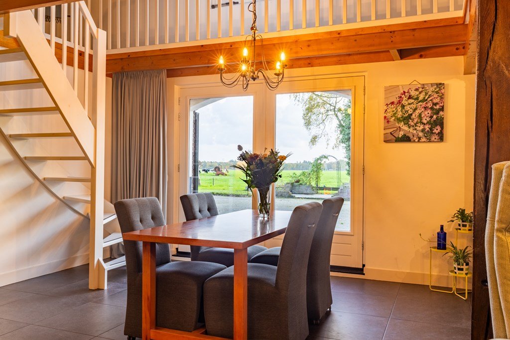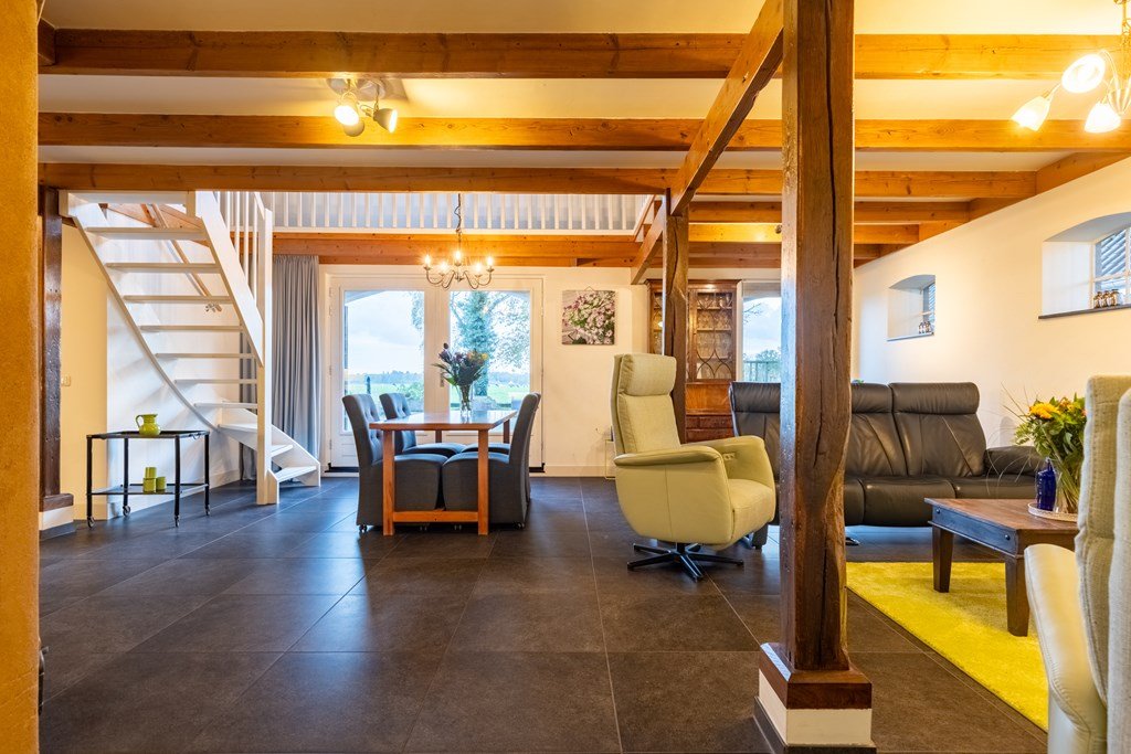 Het hart van de woning is de voormalige deel, nu een indrukwekkende woonkamer met robuuste houten gebinten, hoge plafonds, sfeervolle houtkachel en openslaande deuren naar het terras. Grote ramen zorgen voor veel licht en bieden een prachtig uitzicht over de omliggende weilanden. De ruimte is voorzien van vloerverwarming, wat zorgt voor aangenaam comfort in elk seizoen.