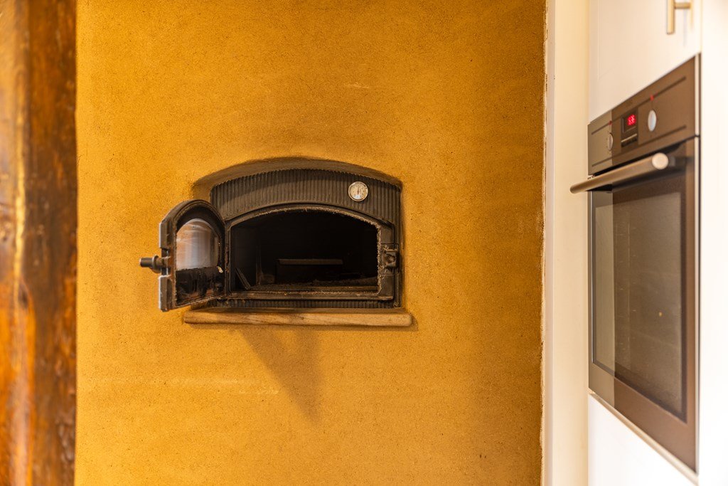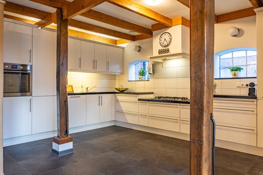 De open keuken sluit naadloos aan op de woonkamer en is modern uitgevoerd, met een groot werkblad, hoogwaardige inbouwapparatuur en zelfs een hout gestookte (pizza) oven – ideaal voor de culinaire liefhebber. De authentieke stalramen geven het geheel een warme, landelijke uitstraling. Aansluitend bevindt zich een ruime bijkeuken met achterom.