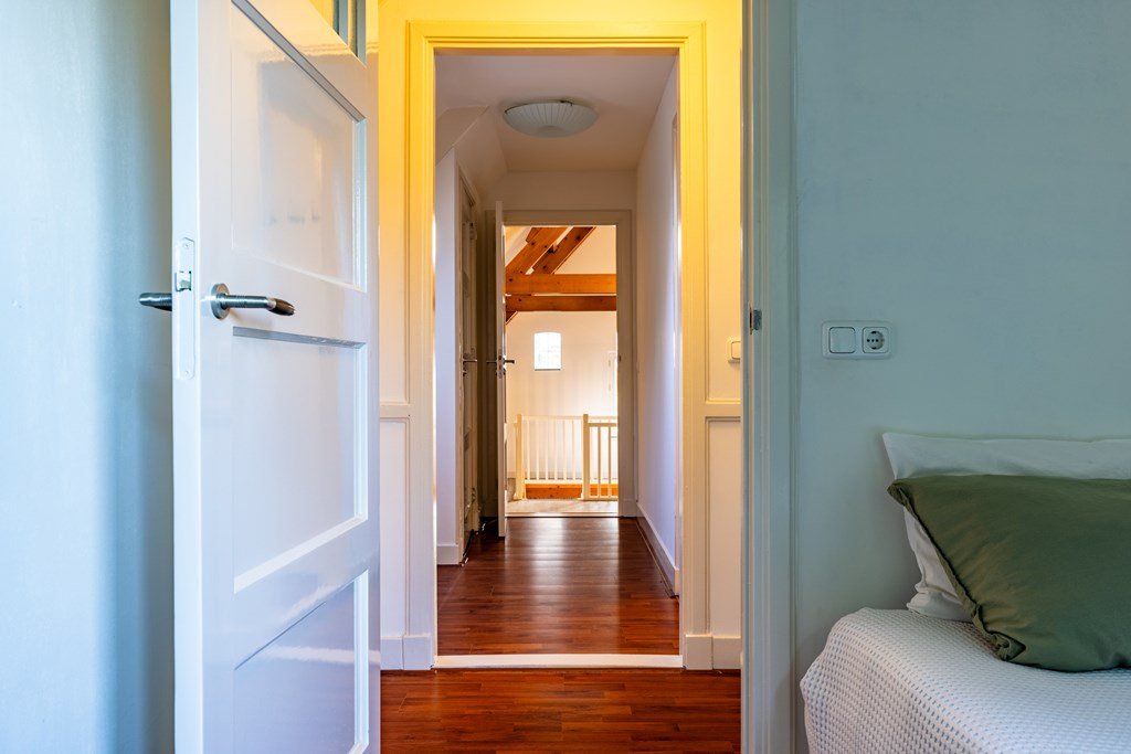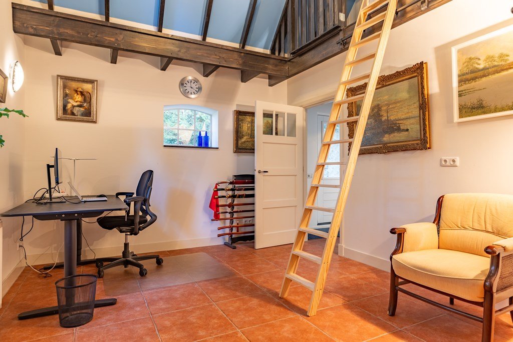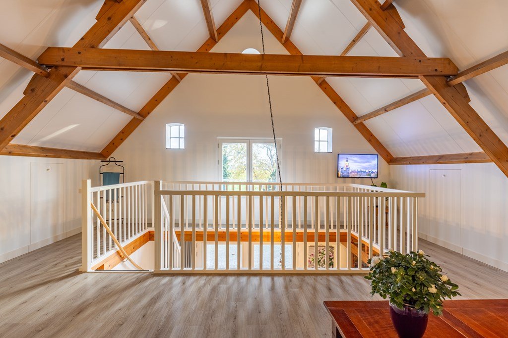 De fraaie vide met zicht op de woonkamer beneden vormt een ware blikvanger en zorgt voor een bijzonder ruimtelijk karakter. Deze open ruimte leent zich uitstekend als tweede woonkamer, eetkamer of bibliotheek en verbindt de woonlagen op sfeervolle wijze.