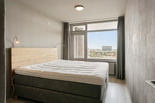 2 ruime slaapkamers waarvan de voorste toegang heeft tot het balkon welke gelegen is op het zuidwesten. Royale woonkamer met prachtig uitzicht over het Europlein en de stad.