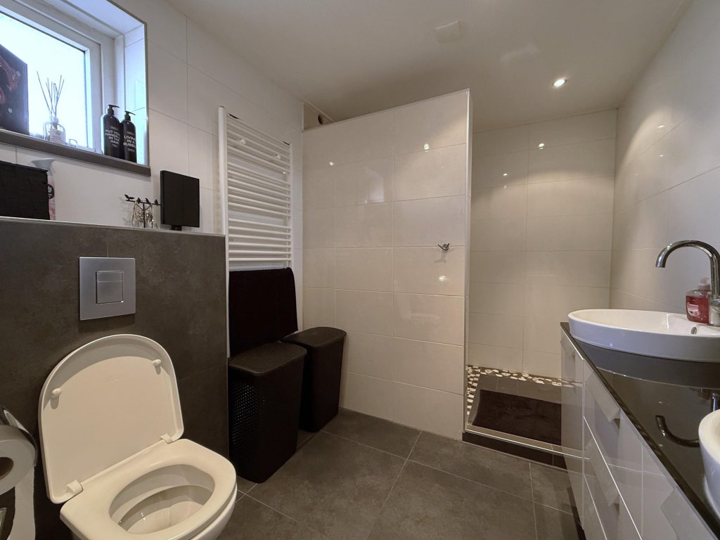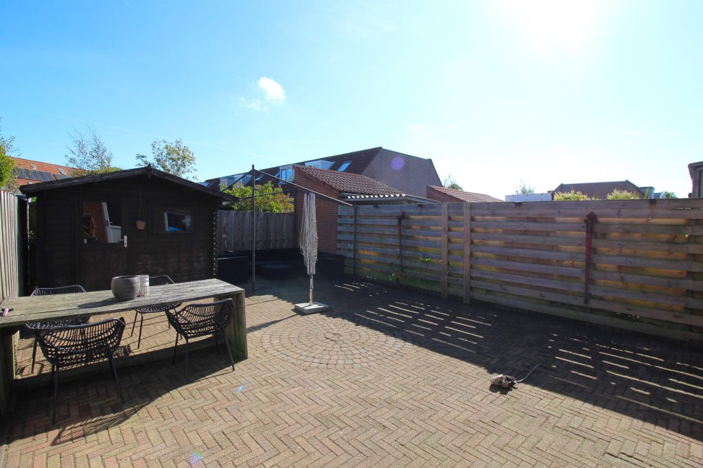 Begane grond: Entree met trapopgang en badkamer met toilet, ruime woonkamer met open keuken, bijkeuken, tuin met houten berging.