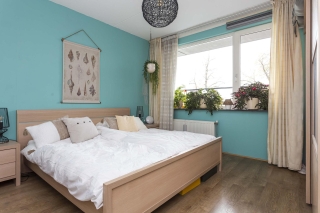 Het appartement beschikt over een lange hal. Meteen rechts zit de ruime slaapkamer met entree naar de badkamer met inloopdouche, wastafel en ruimte voor de wasmachine.