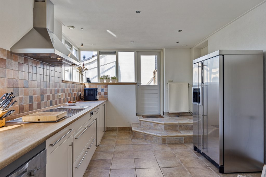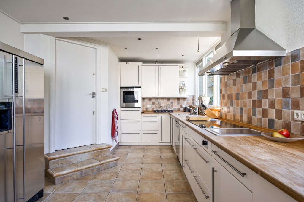 De ruime woonkeuken met veel lichtinval is van alle gemakken voorzien: inbouwspots, een plavuizenvloer met vloerverwarming, een luxe Amerikaanse koelkast en diverse inbouwapparatuur zoals een inductieplaat en oven. Vanuit de keuken bereik je de garage en tuin, de tuin ligt op het zuiden en is ook toegankelijk via een achterom.