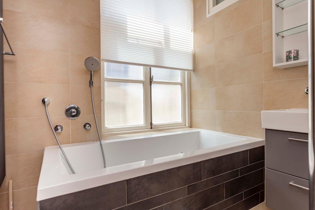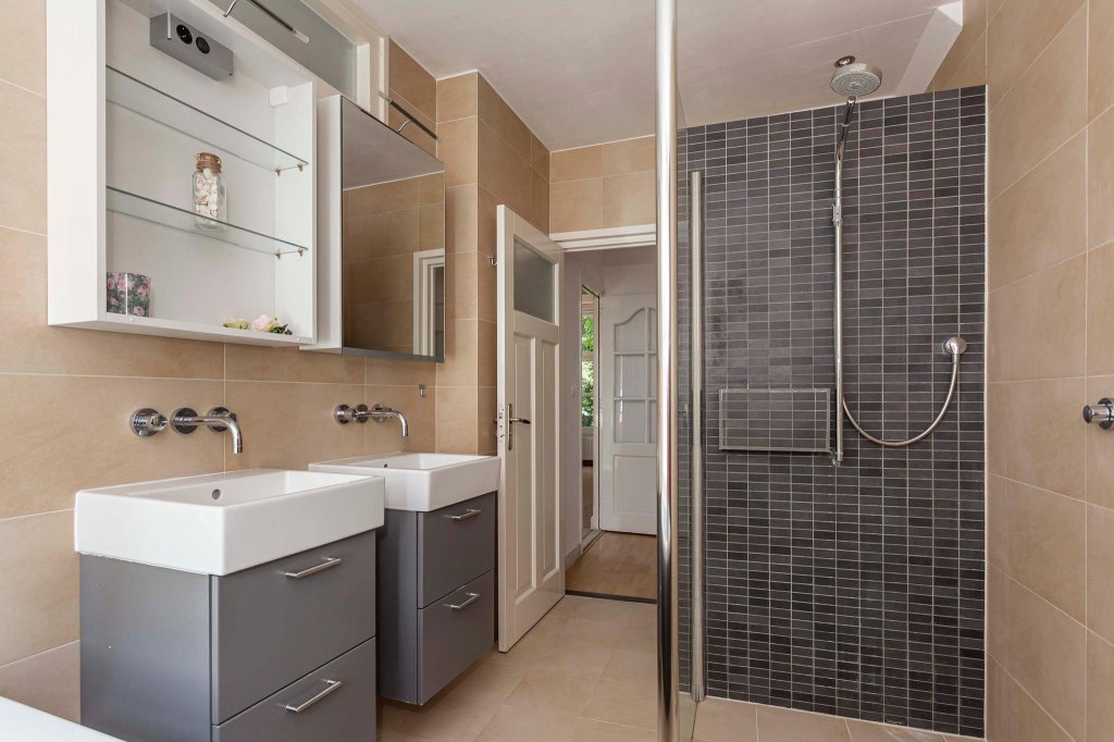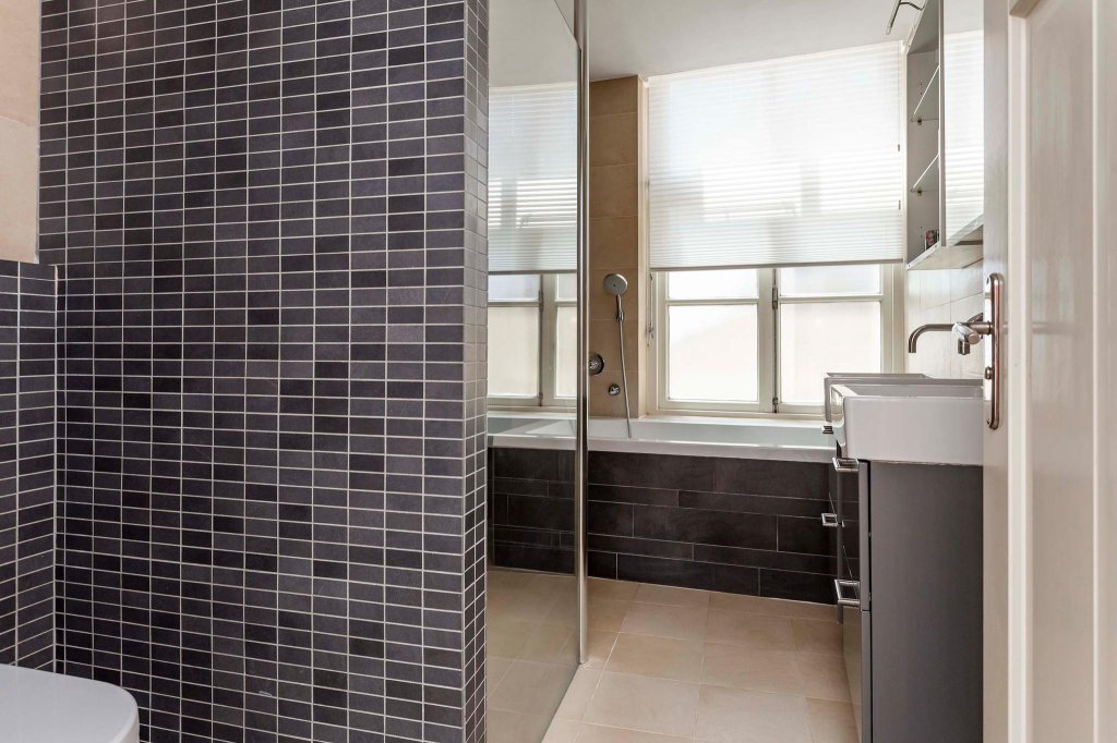 De fraaie badkamer is voorzien van bad, douche, toilet en dubbele wastafel.