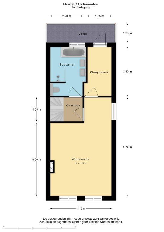 Op de 1e etage treft u de woonkamer – met fabelachtig uitzicht over de Maas- met aansluiting voor houtkachel. Aan de achterzijde ligt een kamer met toegang tot het balkon op het zuiden en daarnaast een royale en bijzonder fraai aangelegde badkamer met bad, douche, wastafelmeubel en toilet.