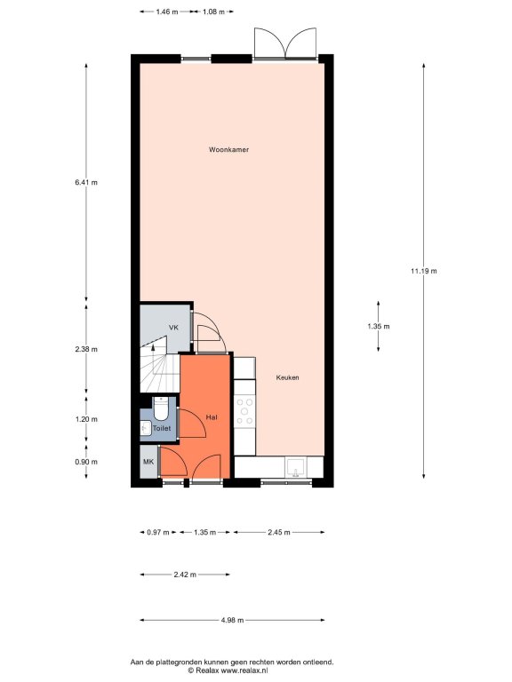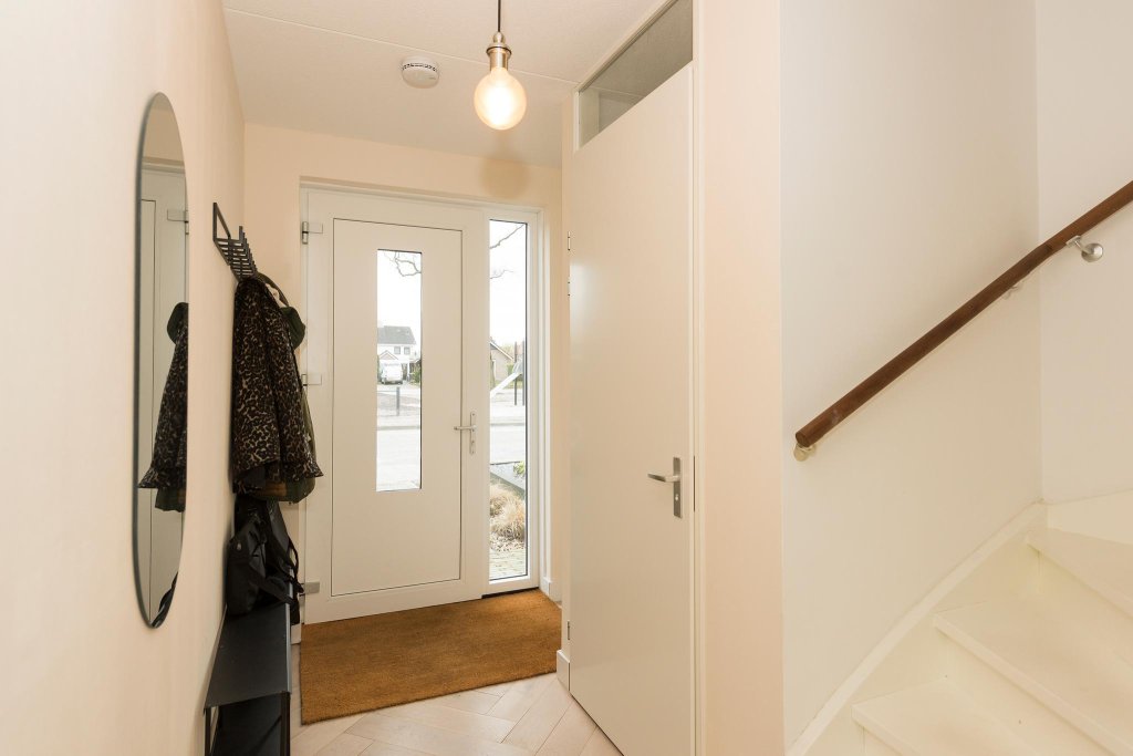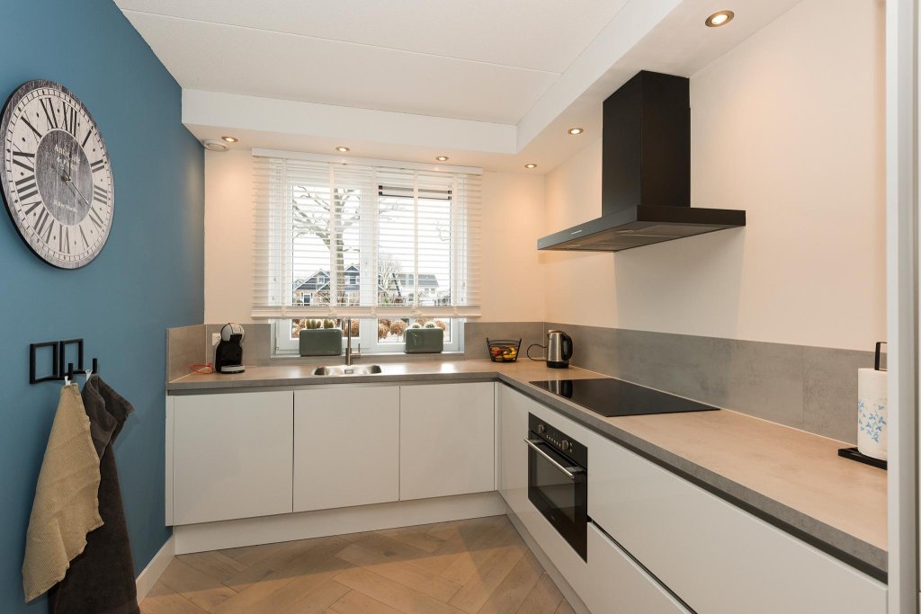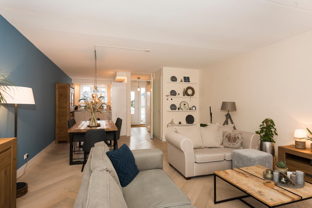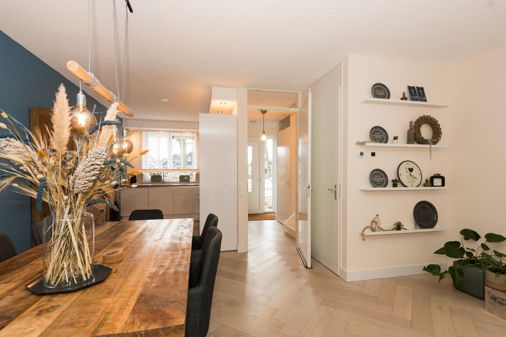 Ruime entree, hal, toilet toegang tot de ruime woonkamer voorzien van een uitbouw van 2,4 meter voorzien van een parketvloer en zeer ruim zitgedeelte, de luxe open keuken is voorzien van een vaatwasser, combimagnetron, koelkast met vriesgedeelte, afzuigkap en een inductiekookplaat via de achterzijde van de woning is de tuin op het noorden te bereiken, deze heeft een achterom en is zeer netjes aangelegd.