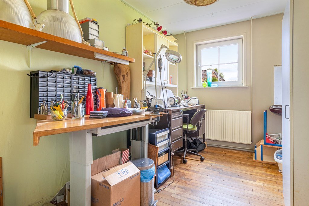 Op de begane grond vinden we o.a. een zeer ruime woonkamer met vide en een plafond tot in de nok. Er zijn veel ramen, waardoor er veel lichtinval is. De woonkamer met openslaande deuren naar het terras, kijkt uit op de prachtige tuin, heeft een leistenen tegelvloer met vloerverwarming en een houtkachel. Hier is ook de trap naar de vide en de toegang naar de kelder.