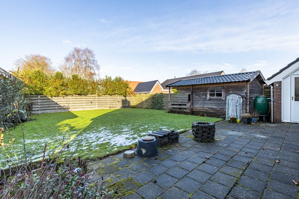 Achter de woning ligt een grote, beschutte tuin met een tuinhuis deels voorzien van een overkapping. Hier geniet je in alle rust van groen, zon en veel privacy. Een heerlijke plek voor lange zomeravonden, een moestuin, speelhoek of ontspanning.