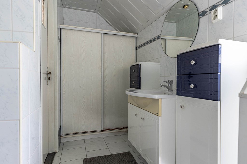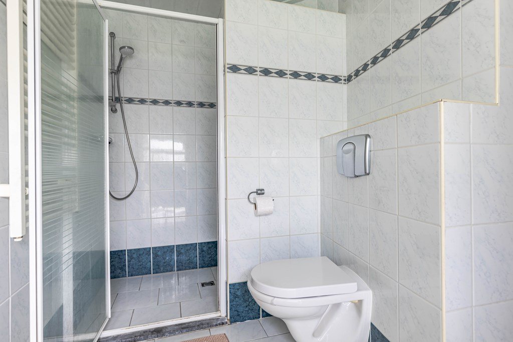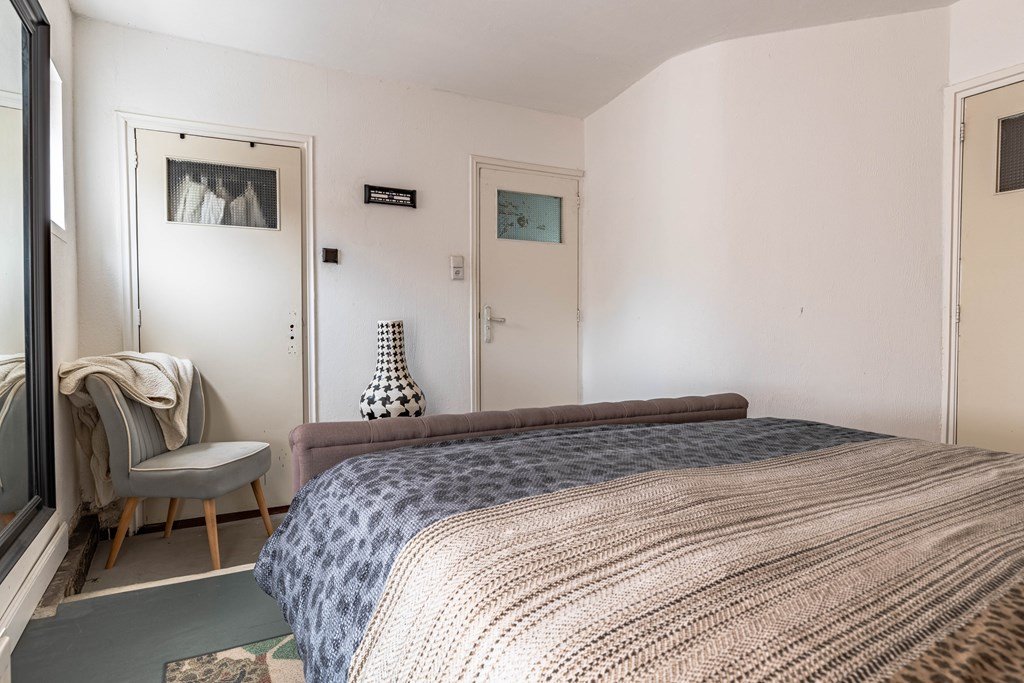 Via de achterzijde van de woning (de hoofdentree) kom je binnen in een ruime hal met aansluitingen voor wasmachine en droger en een praktische inbouwkast. Vanuit hier bereik je een halletje dat toegang geeft tot een slaapkamer met badkamer en toilet, die ook rechtstreeks bereikbaar is vanuit de woonkeuken.