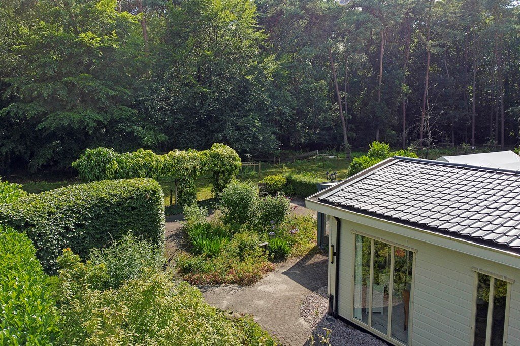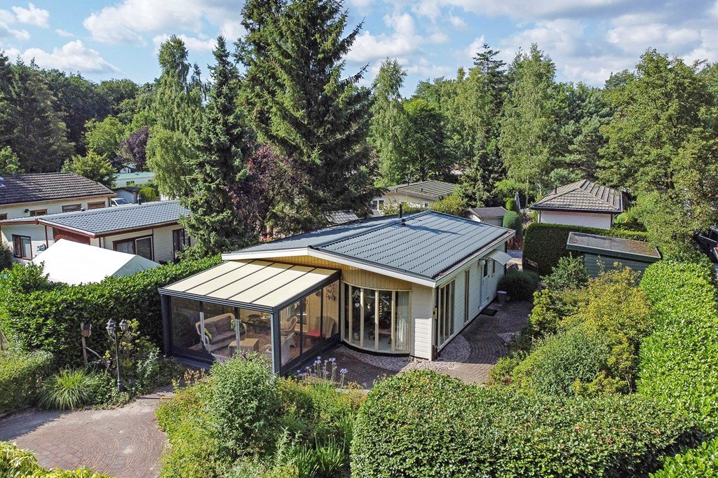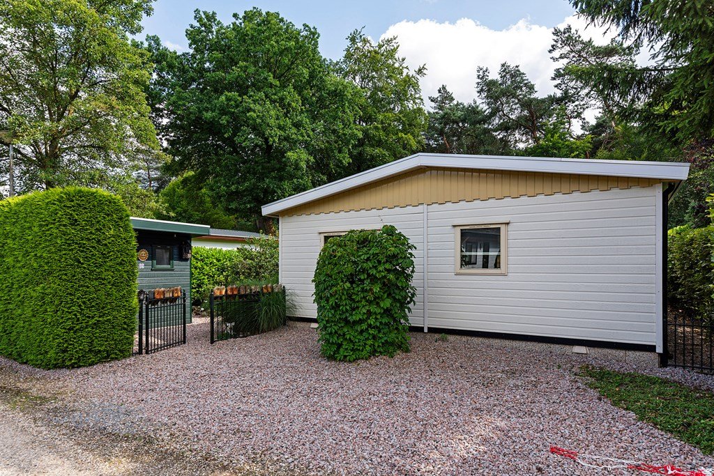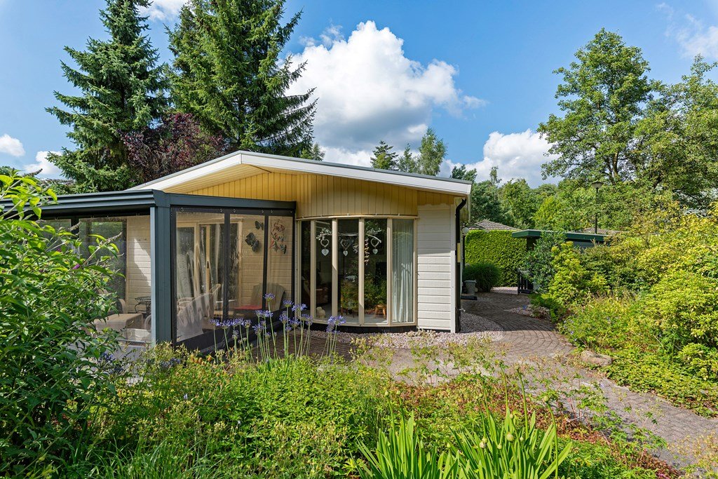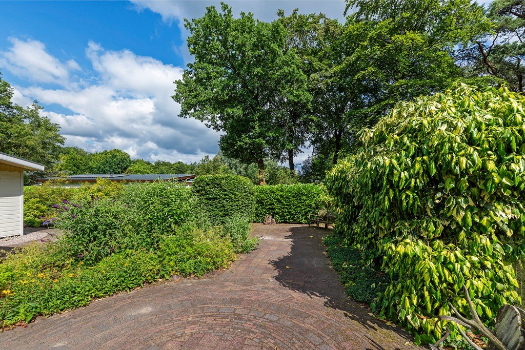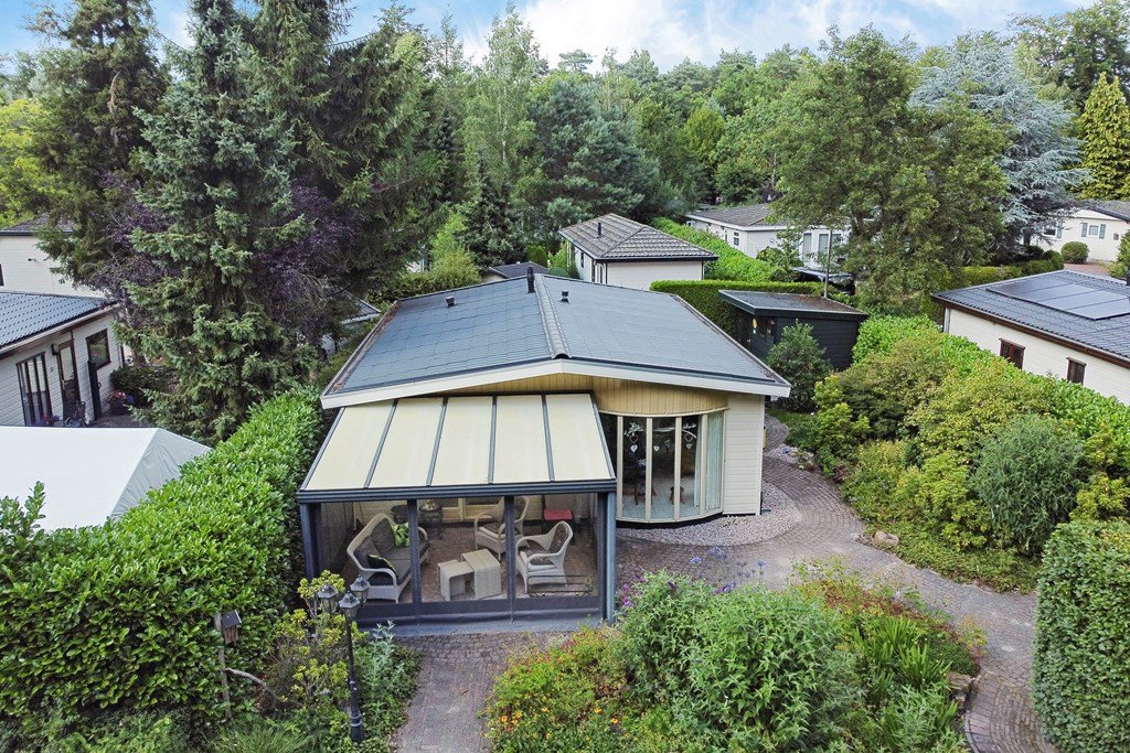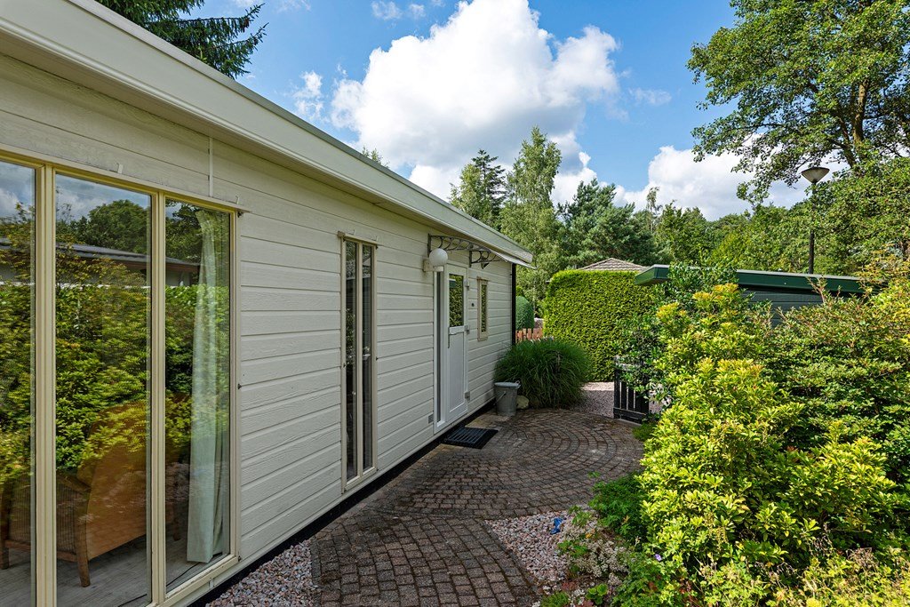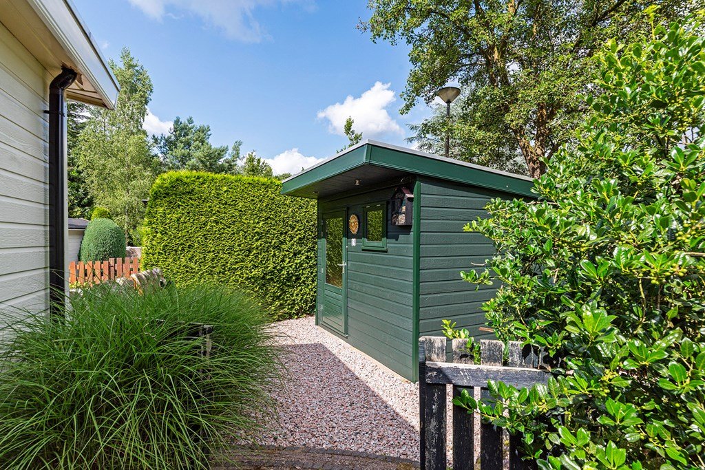 De royale tuin is met zorg aangelegd en heeft diverse terrassen, heerlijk gelegen op het zuiden . In het verleden is er een extra stuk grond bijgekocht. Het totale perceel grenst aan een weide waarin schapen lopen en heeft volledige privacy. Dit maakt het één van de mooiste plekjes op het park! Aan de voorzijde is nog een praktische berging met voldoende ruimte voor fietsen en andere benodigdheden en er is plek om twee auto's te parkeren op eigen terrein.