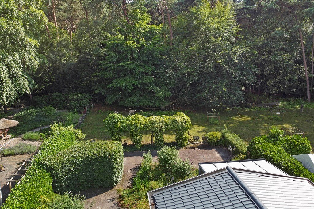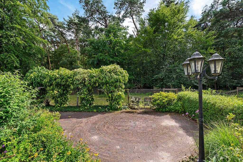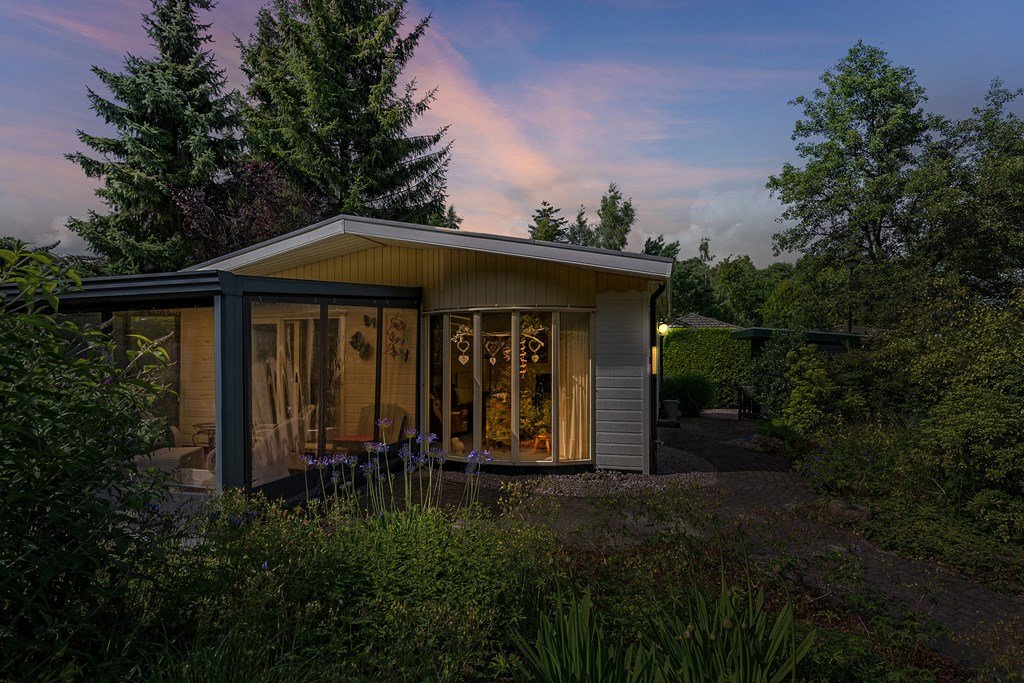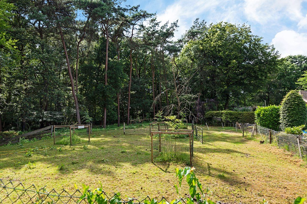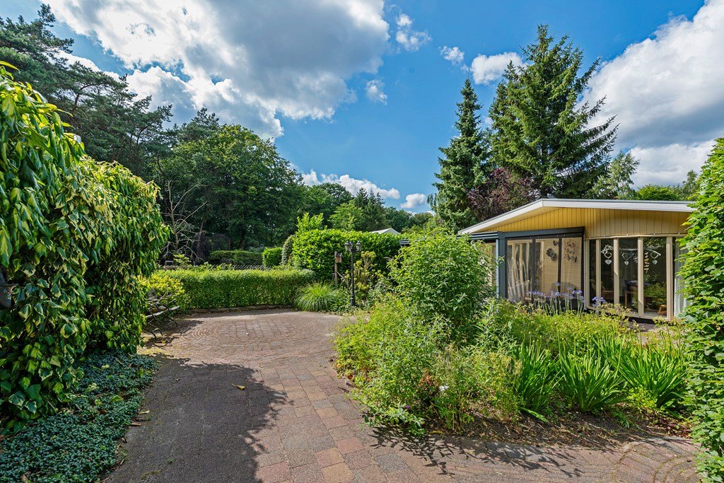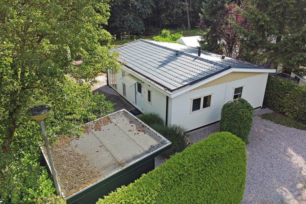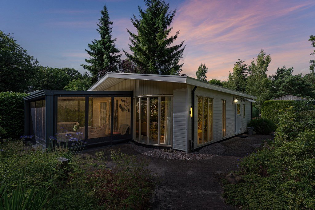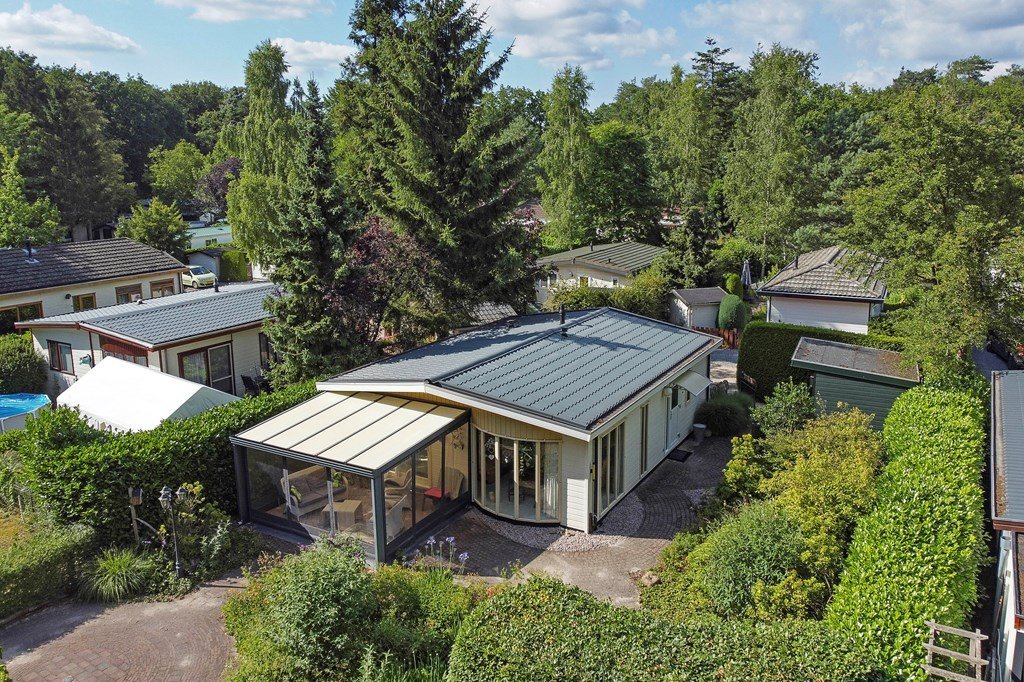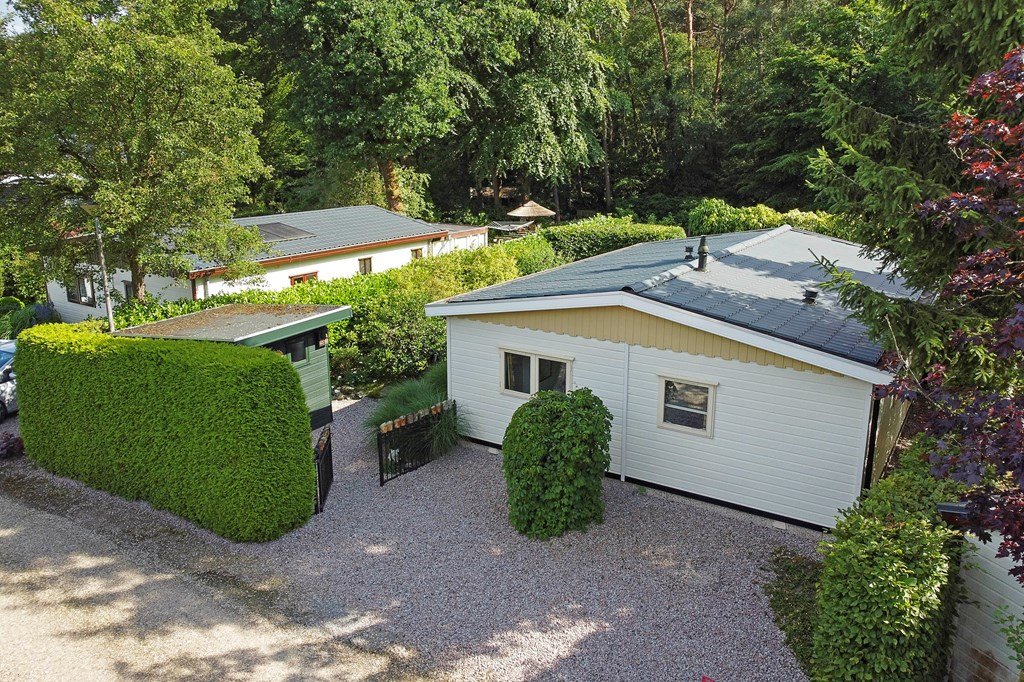 De royale tuin is met zorg aangelegd en heeft diverse terrassen, heerlijk gelegen op het zuiden . In het verleden is er een extra stuk grond bijgekocht. Het totale perceel grenst aan een weide waarin schapen lopen en heeft volledige privacy. Dit maakt het één van de mooiste plekjes op het park! Aan de voorzijde is nog een praktische berging met voldoende ruimte voor fietsen en andere benodigdheden en er is plek om twee auto's te parkeren op eigen terrein.