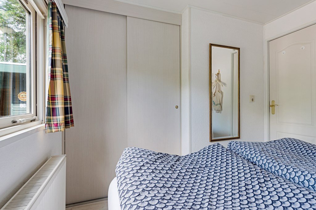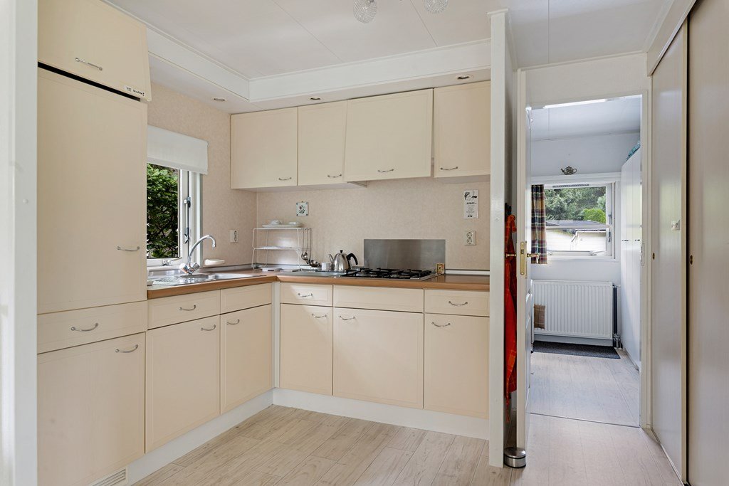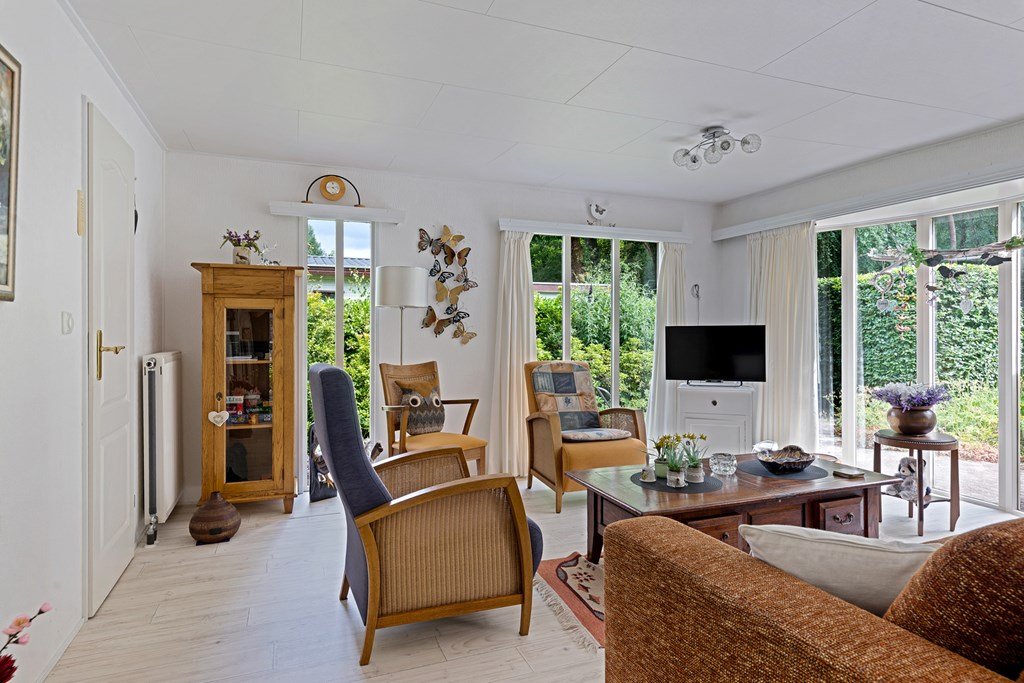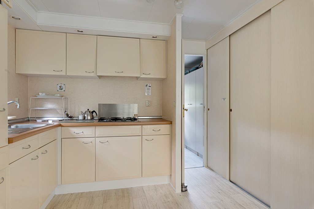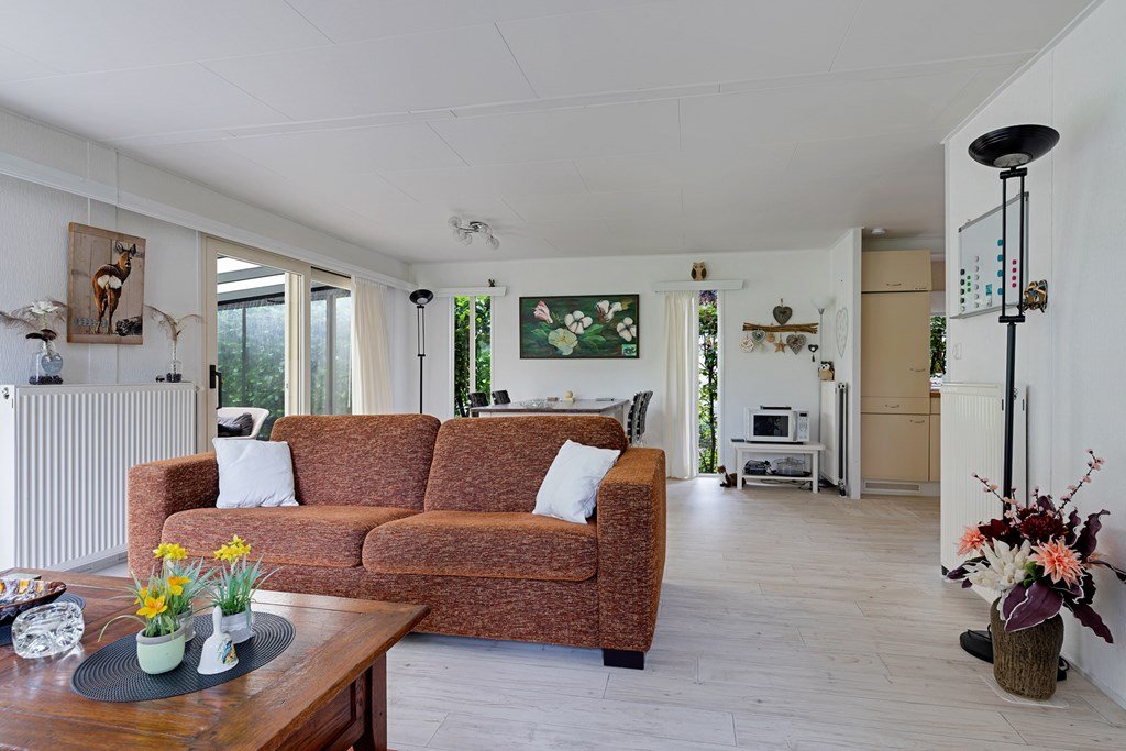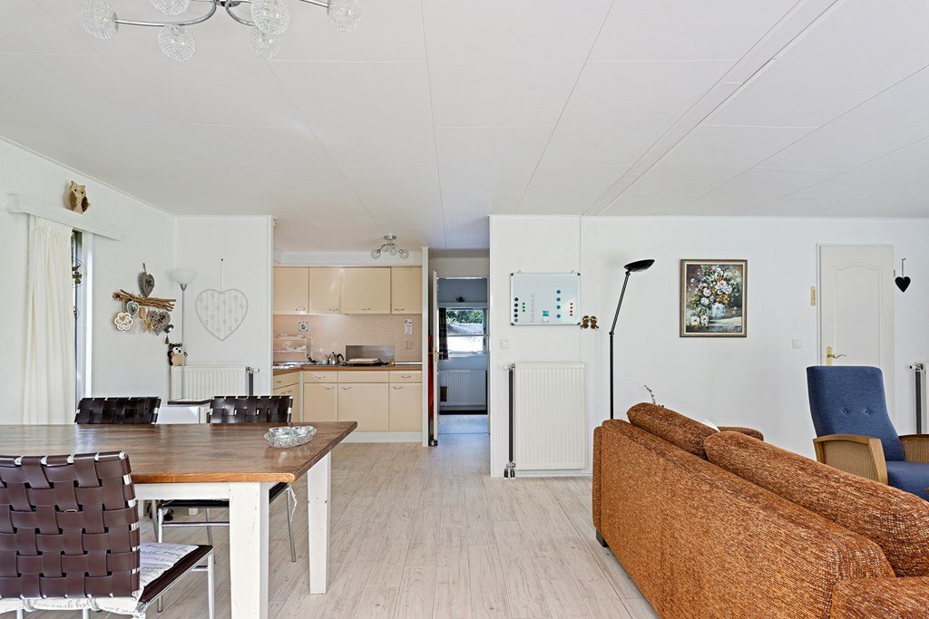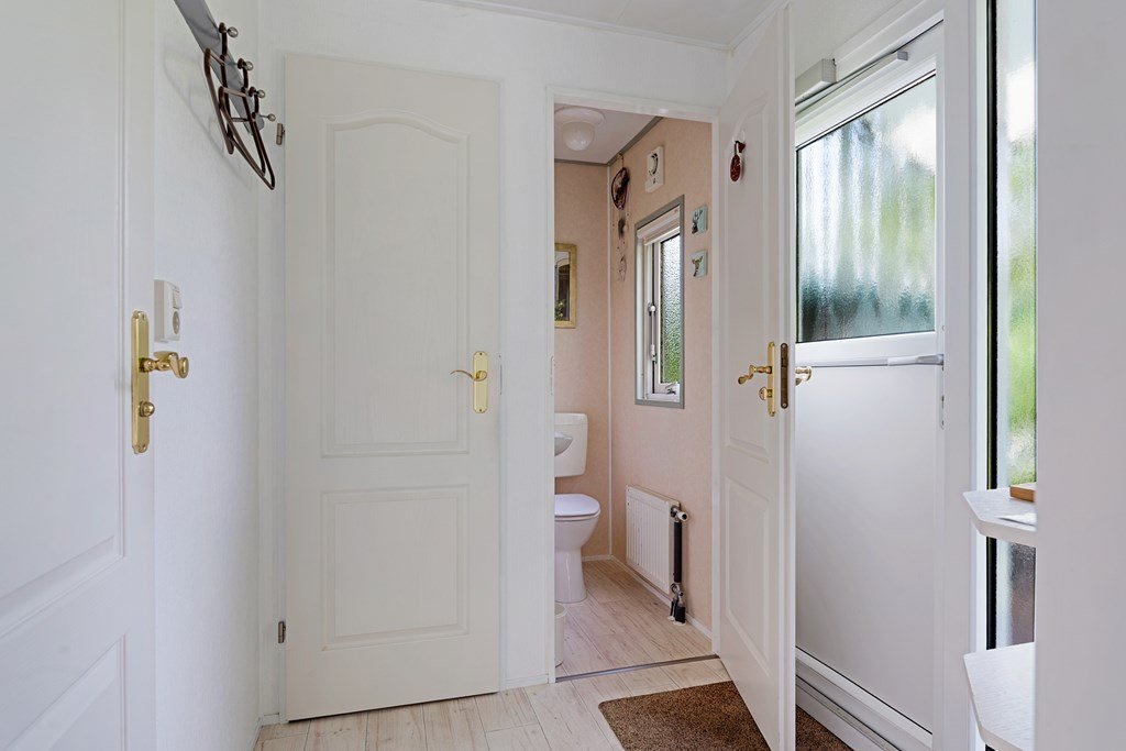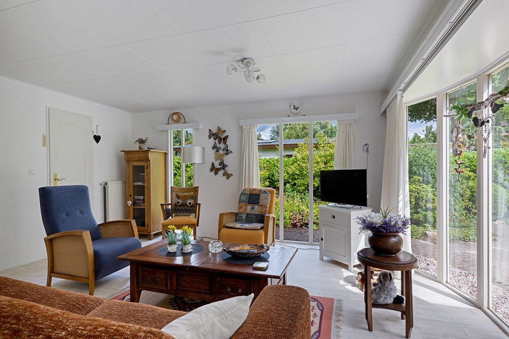 Entree met toegang naar de woonkamer, de hoofdslaapkamer, toilet en badkamer. De woonkamer is door de vele raampartijen heerlijk licht en heeft een prachtig uitzicht over de tuin. Middels een schuifpui bereik je de aangebouwde aluminium overkapping met PVC wanden met ramen en ritsen. Dus naar wens kunt u deze geheel dicht of open maken, De keuken in hoekopstelling is voorzien van een koelkast (dient vervangen te worden), gasfornuis, afzuigkap en veel kastruimte. De twee ruime slaapkamers zijn beiden voorzien van horren voor de ramen en veel kastruimte. De nette badkamer heeft een douche, wastafelmeubel met spiegel en aansluitingen voor de was- en droogapparatuur. Toilet en badkamer zijn beiden voorzien van mechanische ventilatie.
