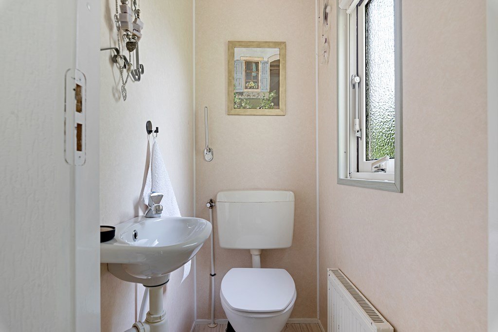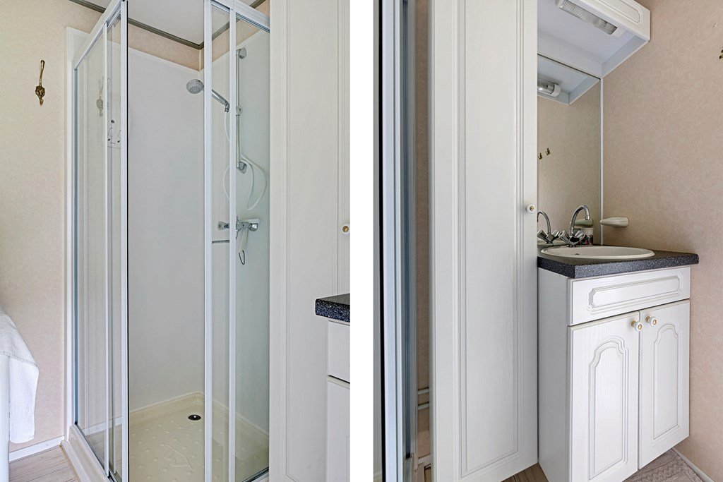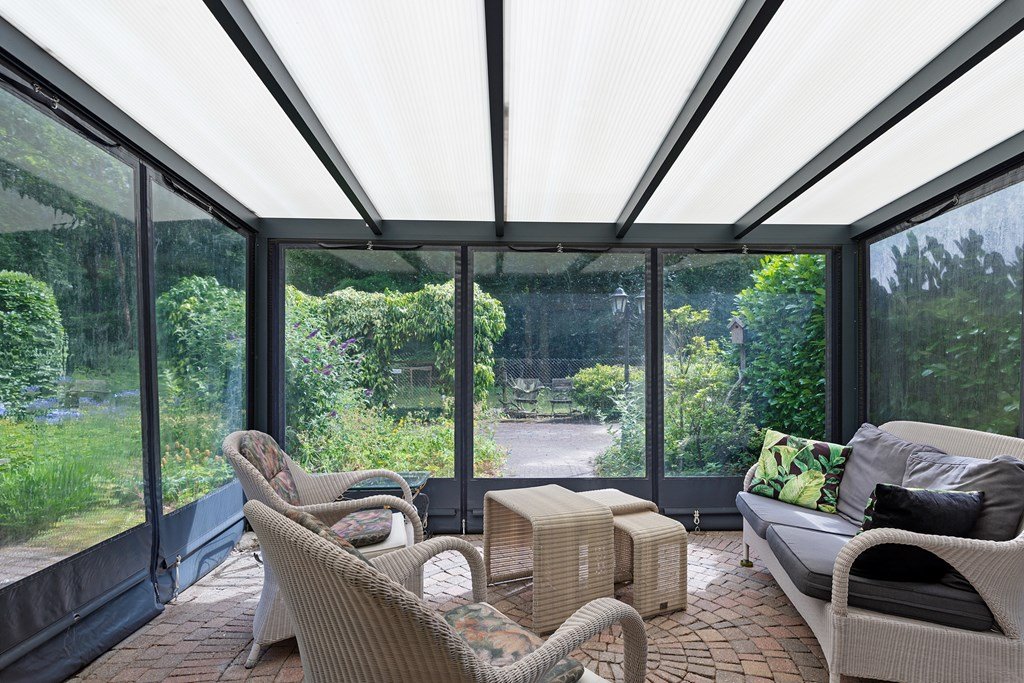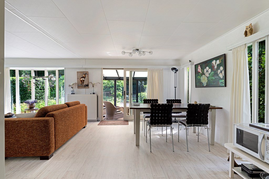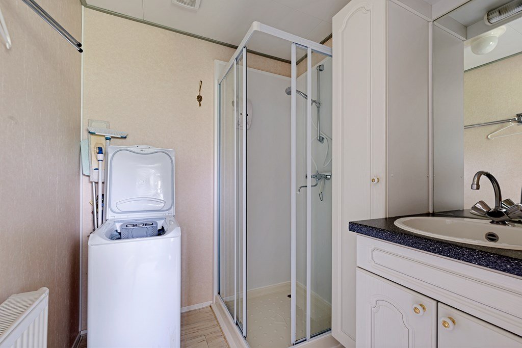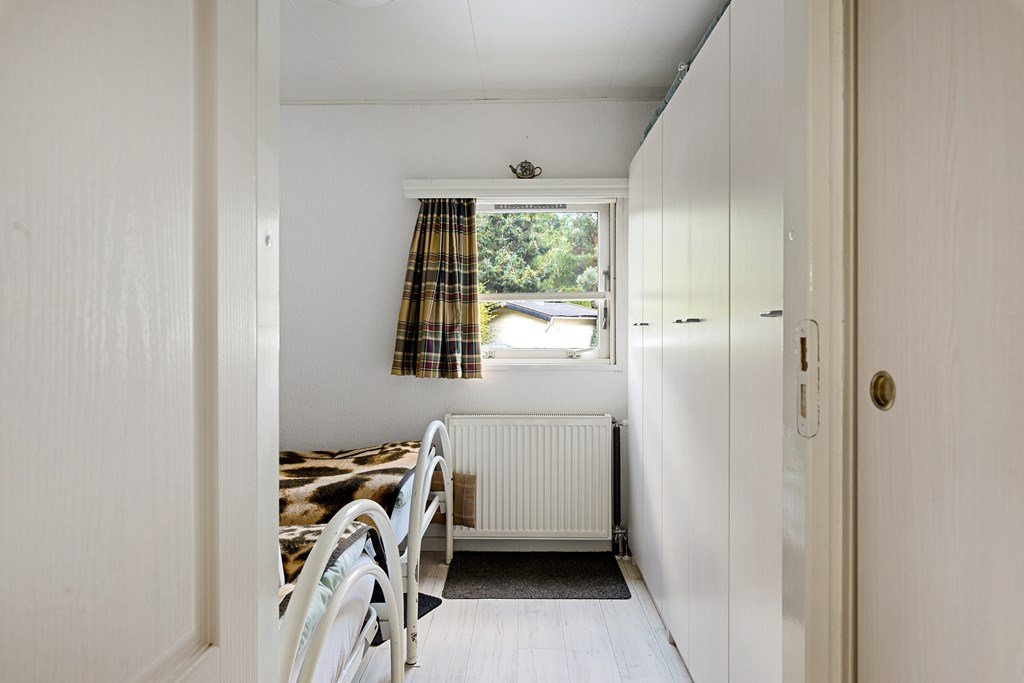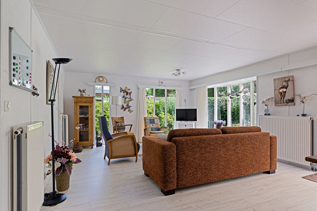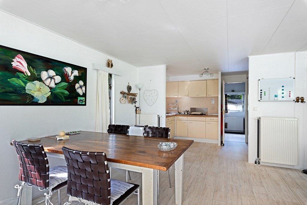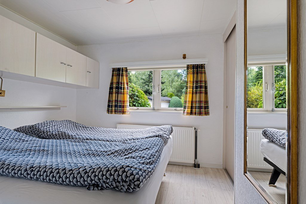 Entree met toegang naar de woonkamer, de hoofdslaapkamer, toilet en badkamer. De woonkamer is door de vele raampartijen heerlijk licht en heeft een prachtig uitzicht over de tuin. Middels een schuifpui bereik je de aangebouwde aluminium overkapping met PVC wanden met ramen en ritsen. Dus naar wens kunt u deze geheel dicht of open maken, De keuken in hoekopstelling is voorzien van een koelkast (dient vervangen te worden), gasfornuis, afzuigkap en veel kastruimte. De twee ruime slaapkamers zijn beiden voorzien van horren voor de ramen en veel kastruimte. De nette badkamer heeft een douche, wastafelmeubel met spiegel en aansluitingen voor de was- en droogapparatuur. Toilet en badkamer zijn beiden voorzien van mechanische ventilatie.