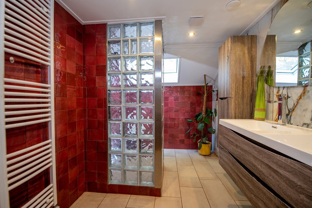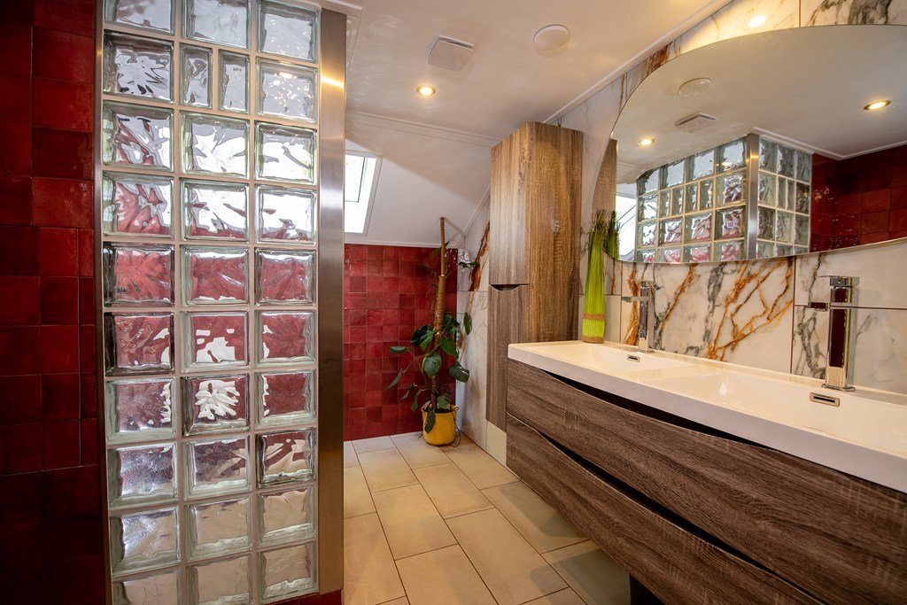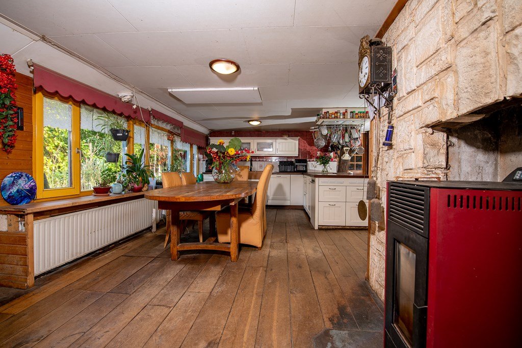 De woonkeuken, met uitzicht op de naastgelegen tuin, brengt meteen de sfeer van heerlijk tafelen en genieten bij de brandende pelletkachel. De royale keuken, voorzien van hardstenen blad, een inductiekookplaat, afzuigunit en vaatwasser, staat in directe verbinding met de achtergelegen hal. Daar bevinden zich het separaat toilet, een royale vernieuwde badkamer voorzien van vloerverwarming, een inloopdouche en dubbele wastafel, de entree naar buiten en een zeer ruime bijkeuken annex wasruimte.
