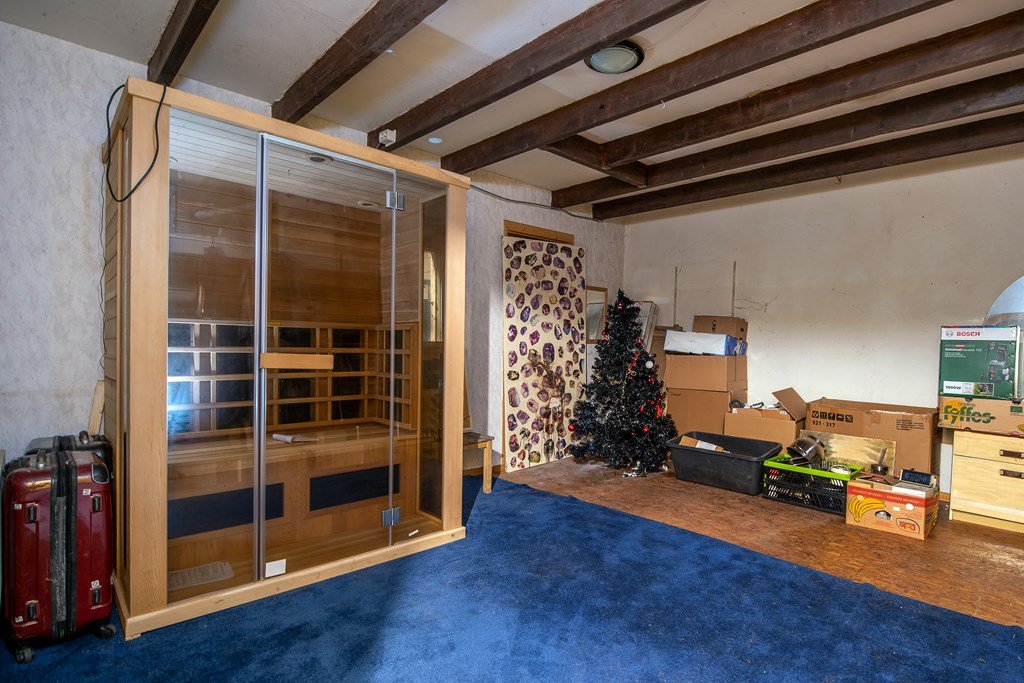 Vanuit deze hal komt u in een kleine entree waaraan een berging en twee kamers liggen. Eén van de kamers is voorzien van een sauna.
