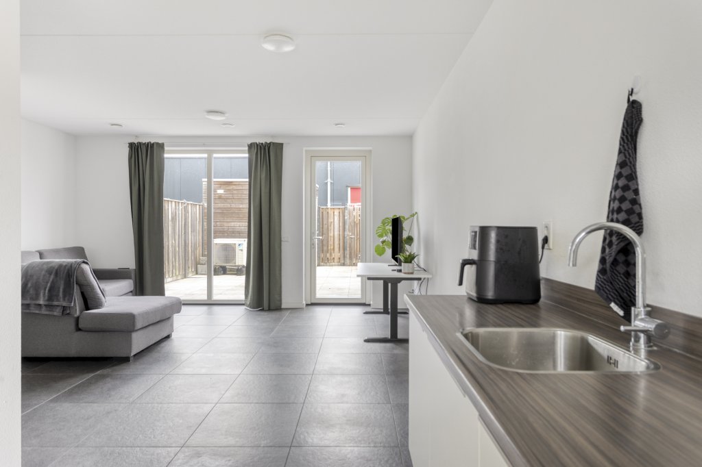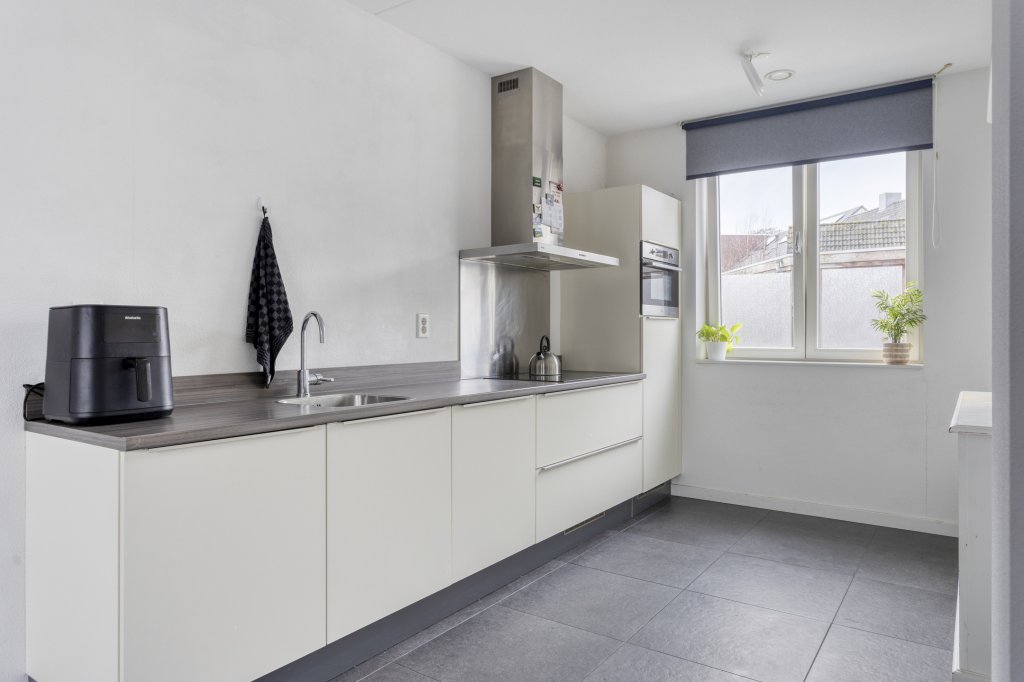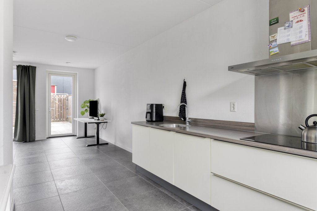 De open keuken is praktisch en stijlvol uitgevoerd in een rechte opstelling met lichte kastfronten. Voorzien van diverse inbouwapparatuur, waaronder een vaatwasmachine, koelkast, inductiekookplaat, afzuigkap en combi-oven. Wonen en koken vloeien hier moeiteloos samen met volop ruimte.