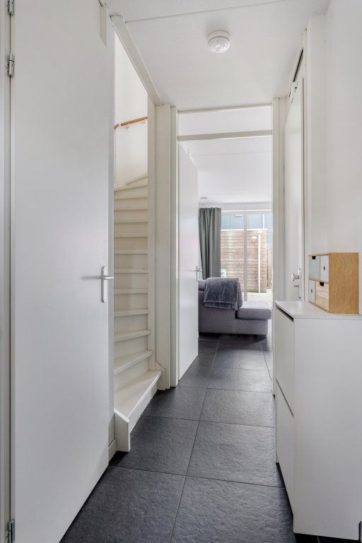 Hal/entree met meterkast, welke toegang geeft tot het toilet, trap naar boven en de woonkamer. De woonkamer is ruim en licht en is voorzien van een mooie tegelvloer. Middels een loopdeur heeft u toegang tot de tuin.