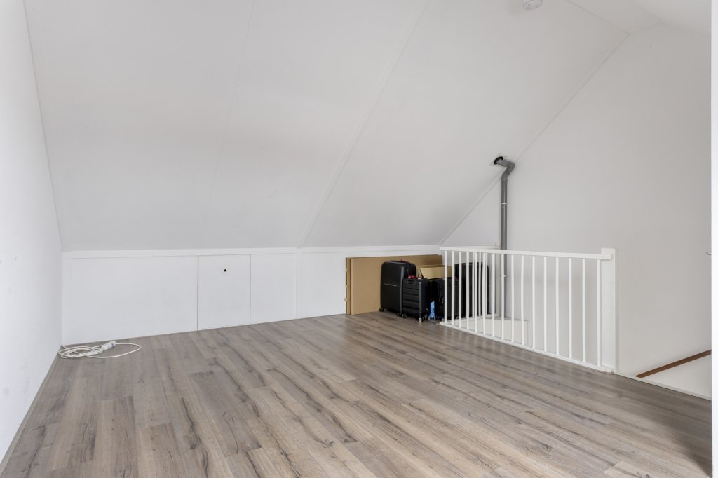 Hier bevindt zich naast de technische ruimte, met aansluiting voor wasmachine, de omvormer van de vier zonnepanelen, nog een enorme zolder waar gemakkelijk een vierde slaapkamer gecreëerd kan worden. Aan beide zijden is er volop bergruimte achter praktische schuifdeuren. De laminaatvloer zorgt voor een nette en verzorgde afwerking.