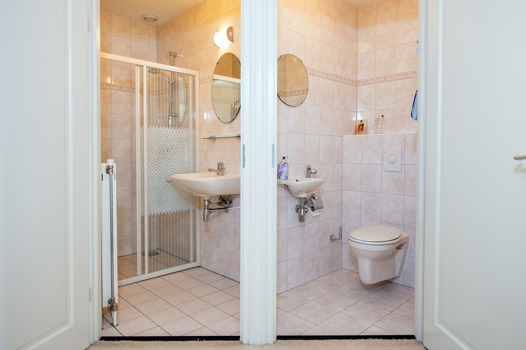 Vanuit de gezamenlijke hal op de 3e verdieping betreedt u het appartement en komt u in de lichte hal met een separaat toilet én een badkamer met douche en wastafel.