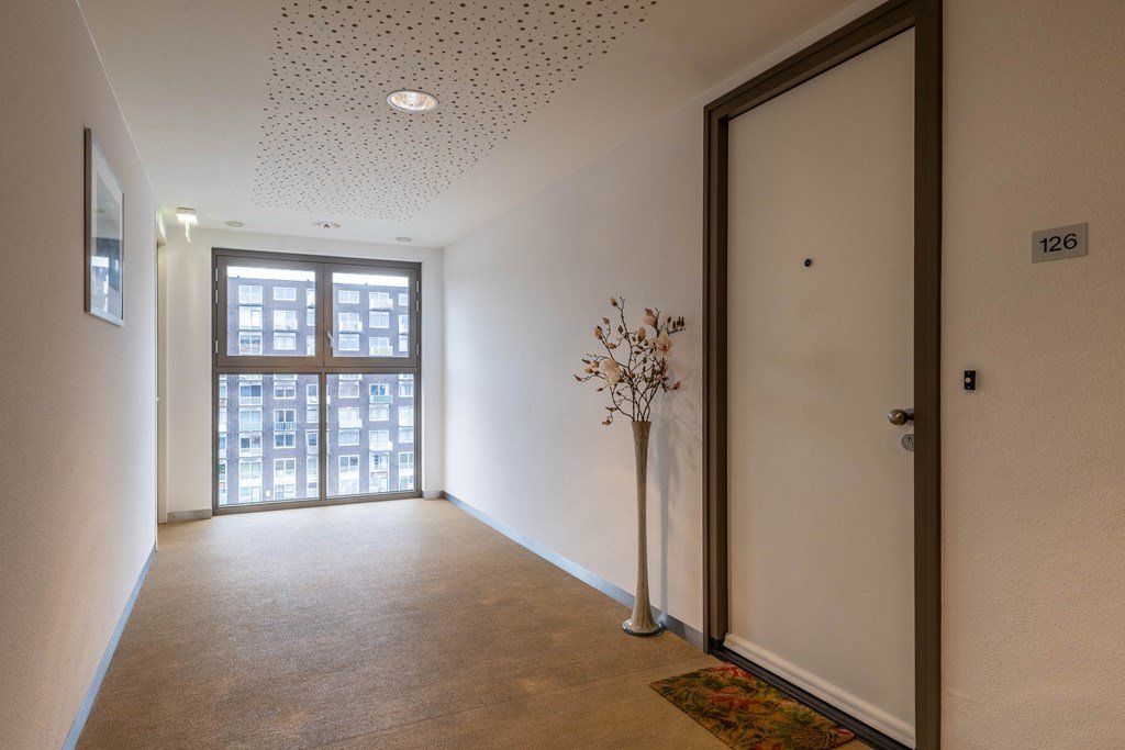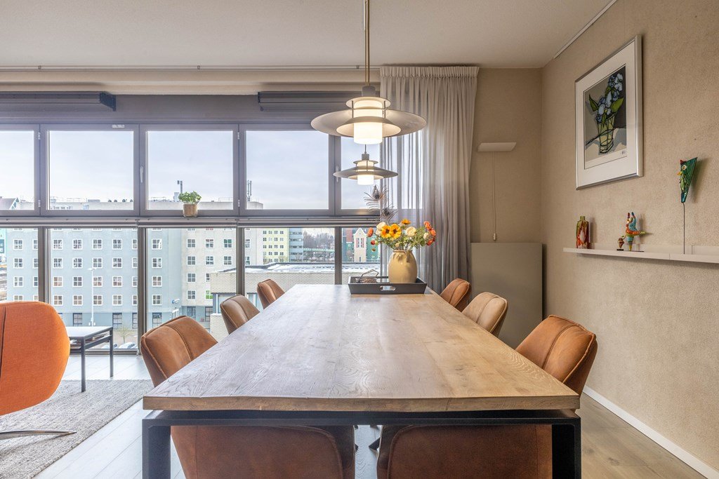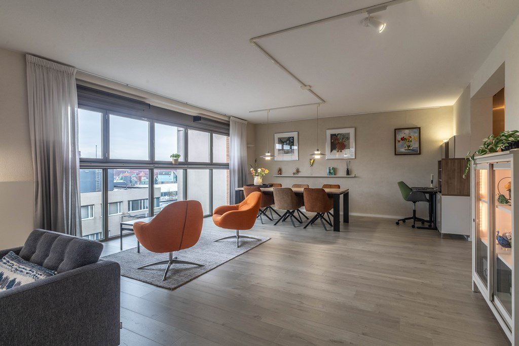 Dit ruime (126m2) fraaie appartement bevindt zich op de 5e verdieping van een verzorgd en modern appartementencomplex. De woonkamer met een half open keuken is een prachtige, zeer ruime lichte leefruimte dankzij de grote raampartijen. Het vrije uitzicht is geweldig; vanuit de woonkamer en beide slaapkamers.