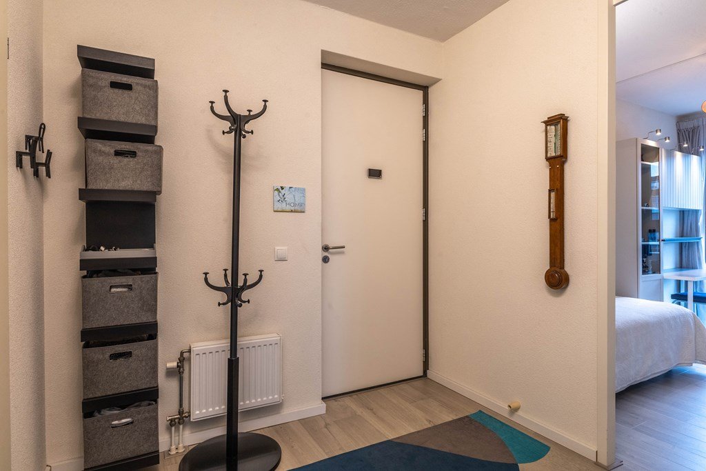 Appartement: Met de lift bereiken we de vijfde verdieping. De ruime entree hal geeft toegang tot de voordeur van de woning. Vanuit de garderobe ruimte geeft het halletje toegang naar alle vertrekken.