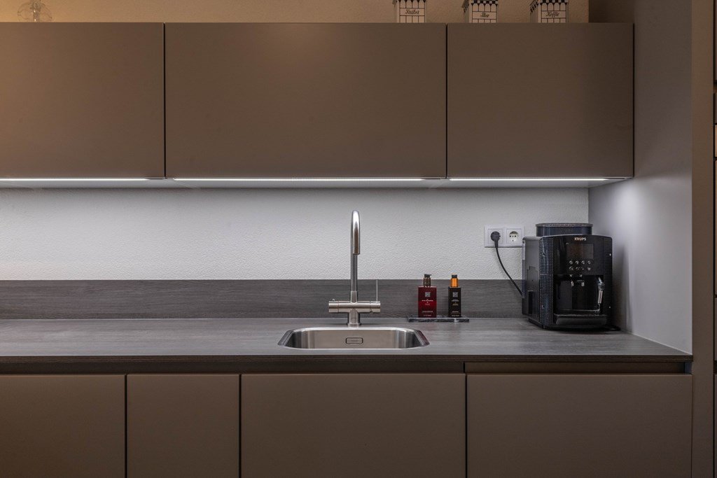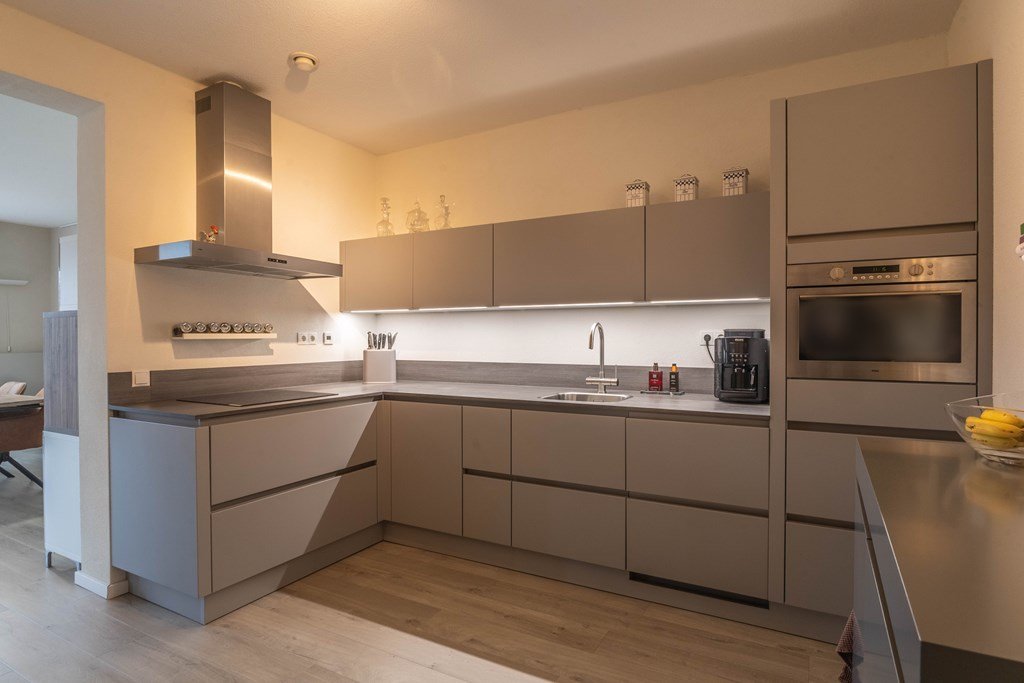 De keuken ligt aan de achterzijde van de woonkamer. Deze Bruynzeel keuken is voorzien van een vaatwasser, spoelbak en diverse opbergmogelijkheden. Koken doet men op een vier-pits inductieplaat onder een afzuigkap. De extra brede werkplaat maakt het koken extra leuk. Daarnaast beschikt de spoelbak over een Quooker en biedt de grote Amerikaanse koelkast extra veel ruimte voor groenten, vlees en overige etenswaren. Uiteraard ontbreekt een combi oven-magnetron niet.