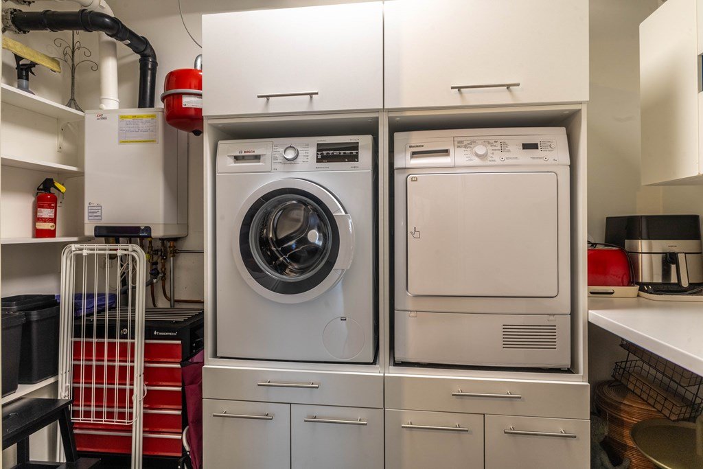 In de bijkeuken heeft men in een handige inbouwkast de wasmachine en droger staan. Hier hangt ook de ketel. Daarnaast is genoeg plek voor het opbergen van handdoeken en of wasmiddelen.