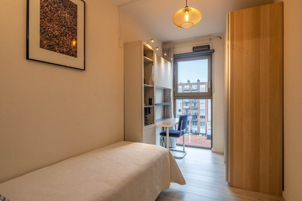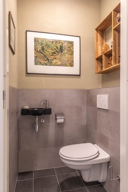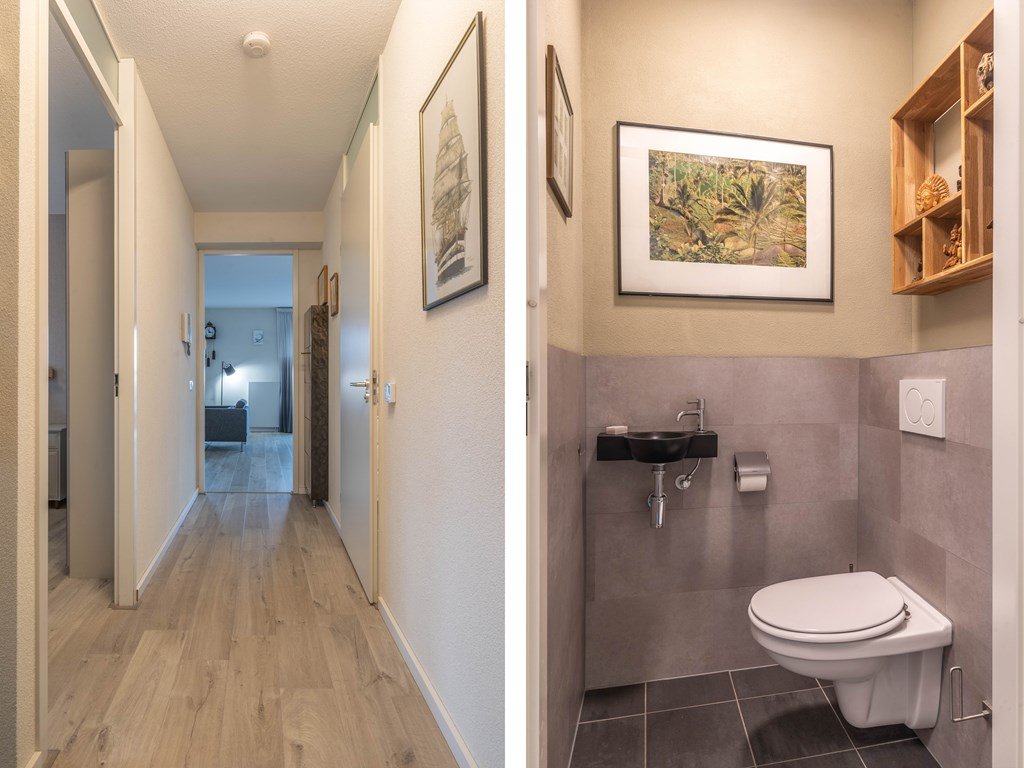 We beginnen met een iets kleinere slaapkamer aan de linkerkant en aan de rechterkant het toilet. Het toilet heeft een hangcloset en een design fonteintje. Geen zorgen voor het lichtknopje s avonds want de verlichting gaat automatisch aan en uit.