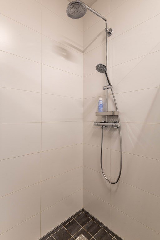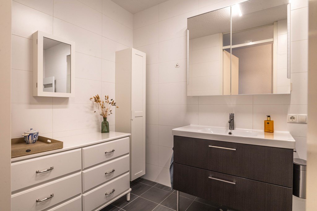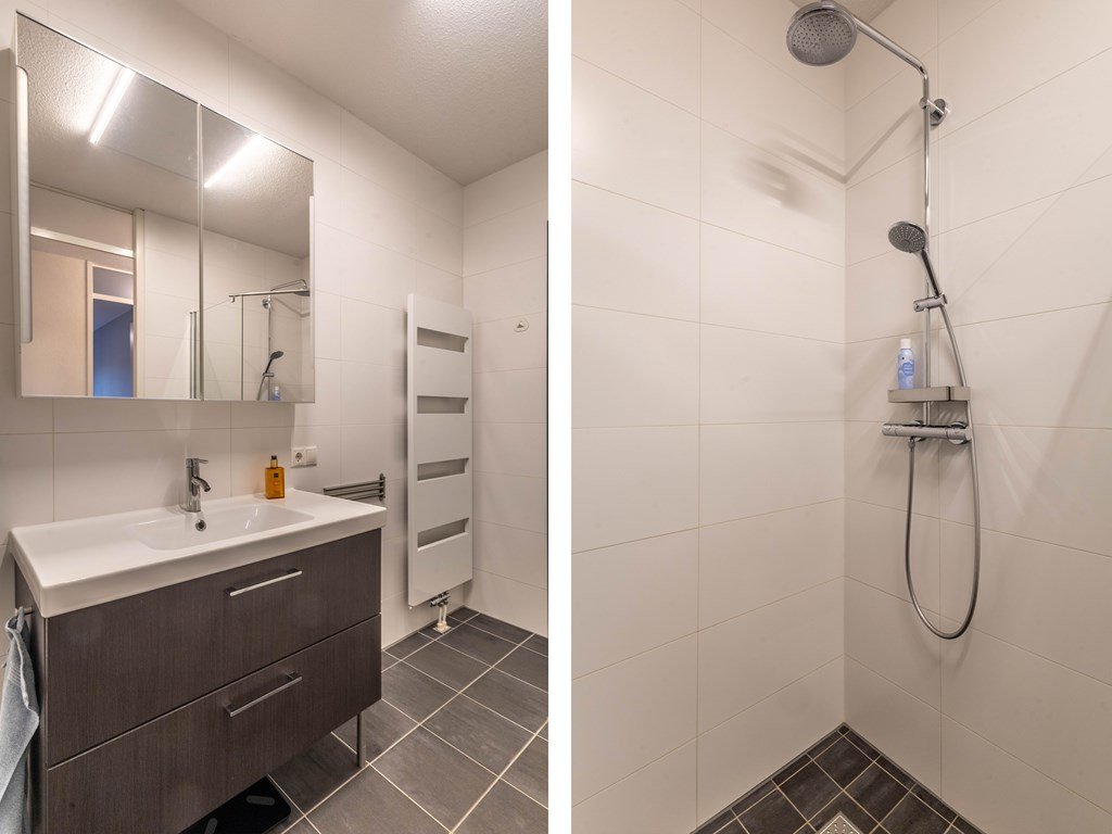 Verder doorlopend in de hal vinden wij links de masterbedroom en rechts de badkamer. Deze ruime badkamer bestaat uit een wastafel meubel met spiegelkast, een ruime inloopdouche met regenshower en design radiator.