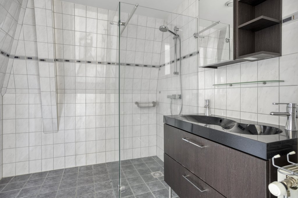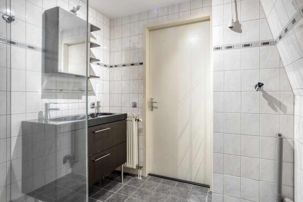 De badkamer is modern en stijlvol uitgevoerd. Hier vindt u een dubbele wastafel, een glazen douchewand die eenvoudig schoon te houden is, en een aansluiting voor de wasmachine. De ruimte is ruim van opzet en praktisch ingedeeld, zodat u alle voorzieningen bij de hand heeft.