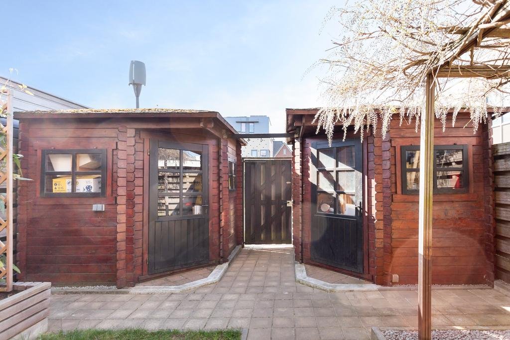 Mooi aangelegde tuin (van 12.3 x 5.9 meter) met achterom, 2 tuinhuisjes en overkapping.