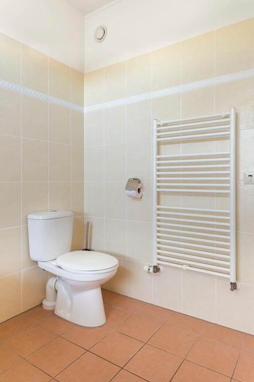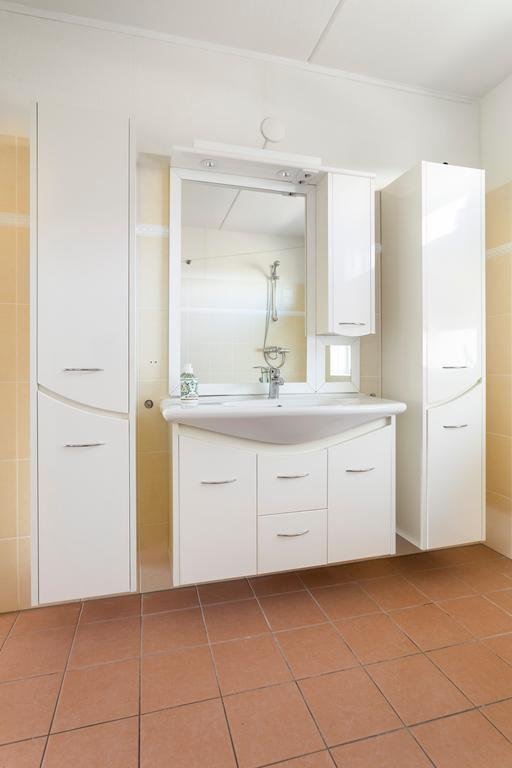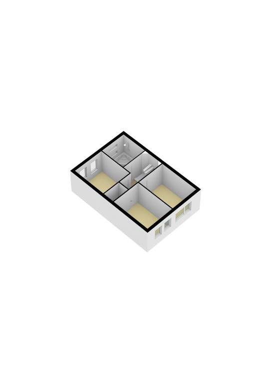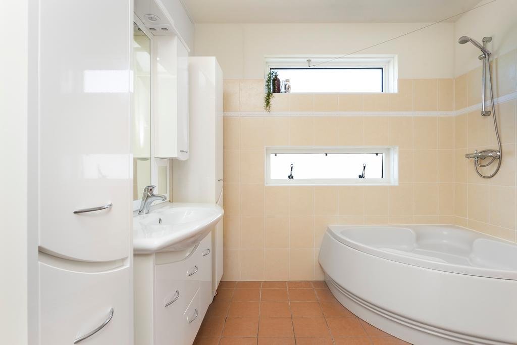 Overloop, 3 slaapkamers, badkamer met douche, wc, wastafel met wastafelmeubel en hoekbad, aparte bergruimte met aansluiting voor wasmachine en droger.