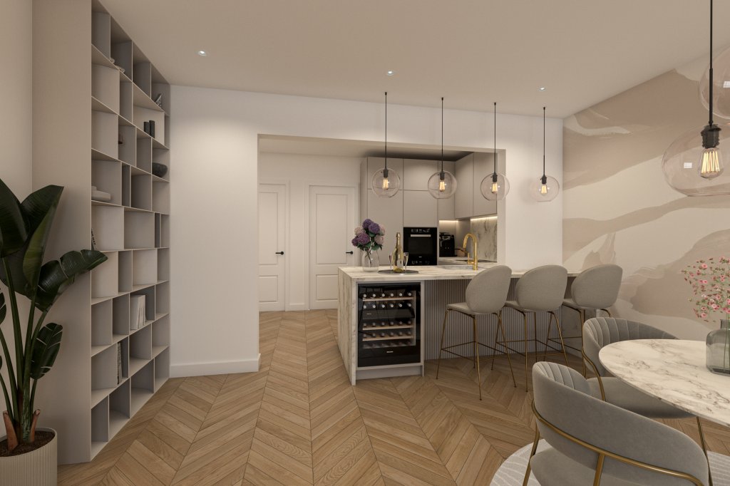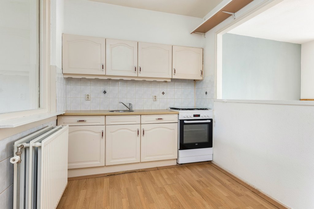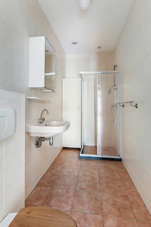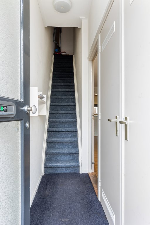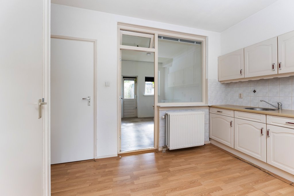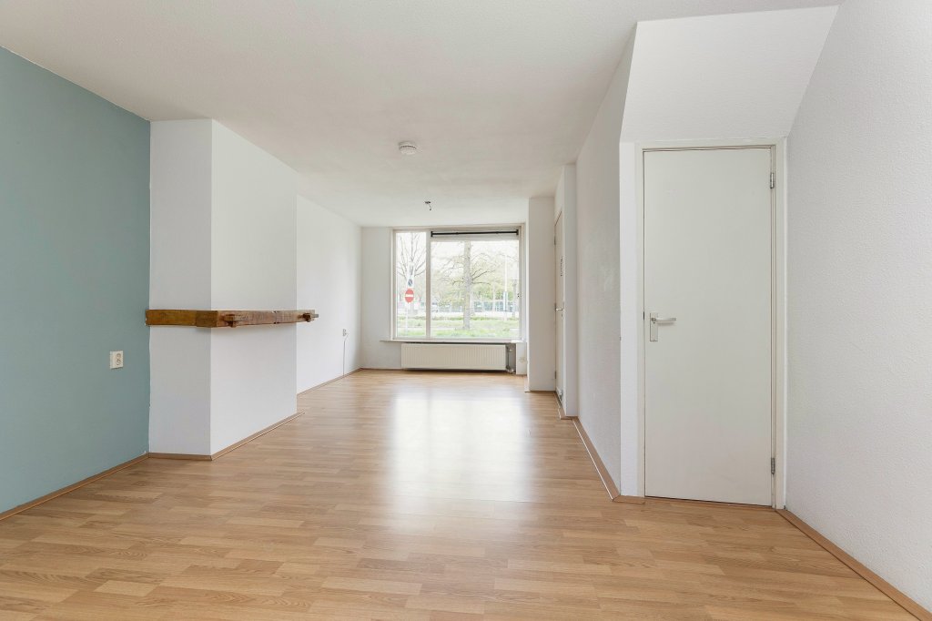Via de gedeelde hal kom je bij je eigen meterkast en voordeur. De woonkamer is ruim en biedt door de halfopen keuken volop mogelijkheden voor een eigentijdse indeling – denk aan een gezellige woonkeuken met bar! Toen wij de visual van onze fotograaf zagen, kregen we op kantoor spontaan zin om zelf te gaan verbouwen. En mocht je daar nog even mee willen wachten: de woning is tot voor kort bewoond geweest, dus je kunt er in principe ook voor eerst zo in.