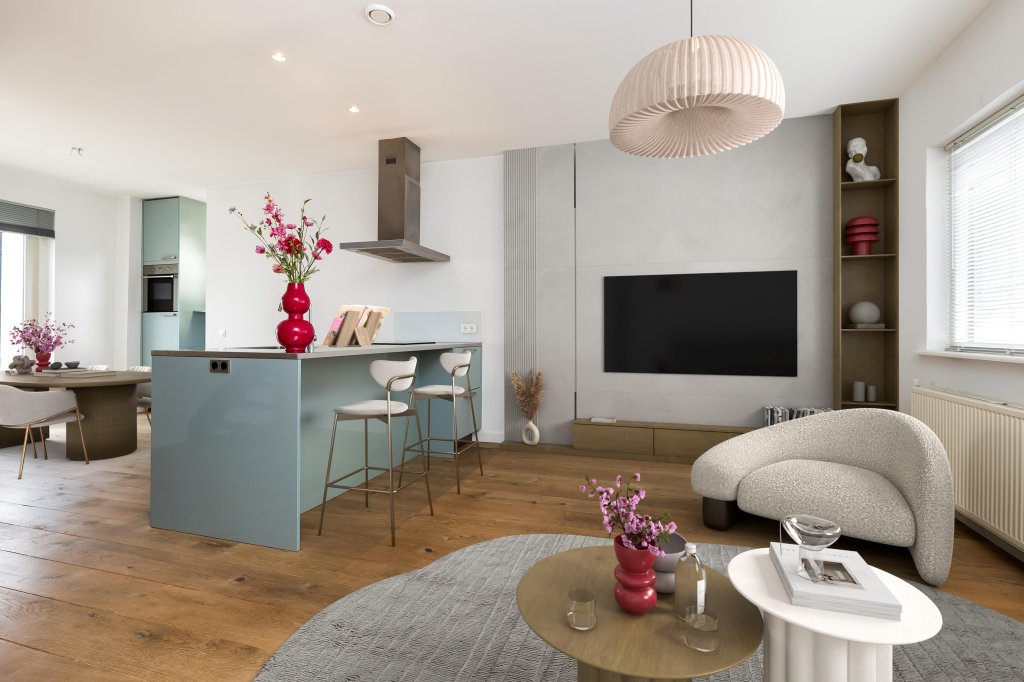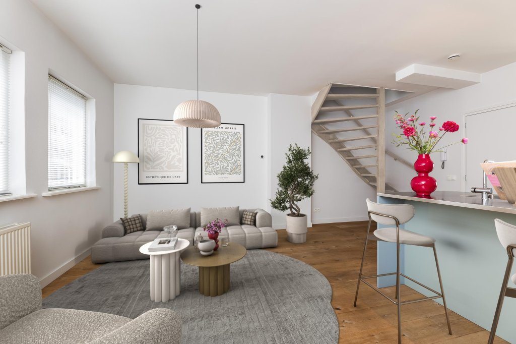 Zodra je de woning binnenstapt, word je verwelkomd door een lichte en royale woonkamer met open keuken. De schitterende massief houten vloer geeft de ruimte direct een warme en stijlvolle uitstraling.