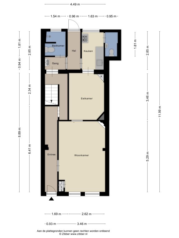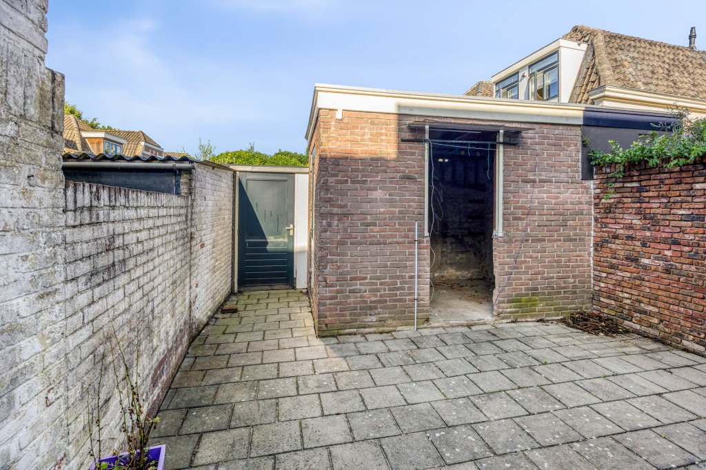 Entree, hal, woonkamer, eetkamer, keuken, toilet, badkamer met tweede toilet en toegang tot de zonnige achtertuin op het westen met achterom en stenen schuurtje.