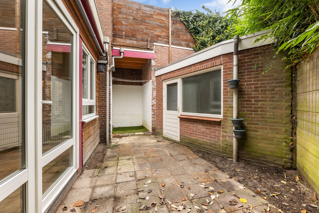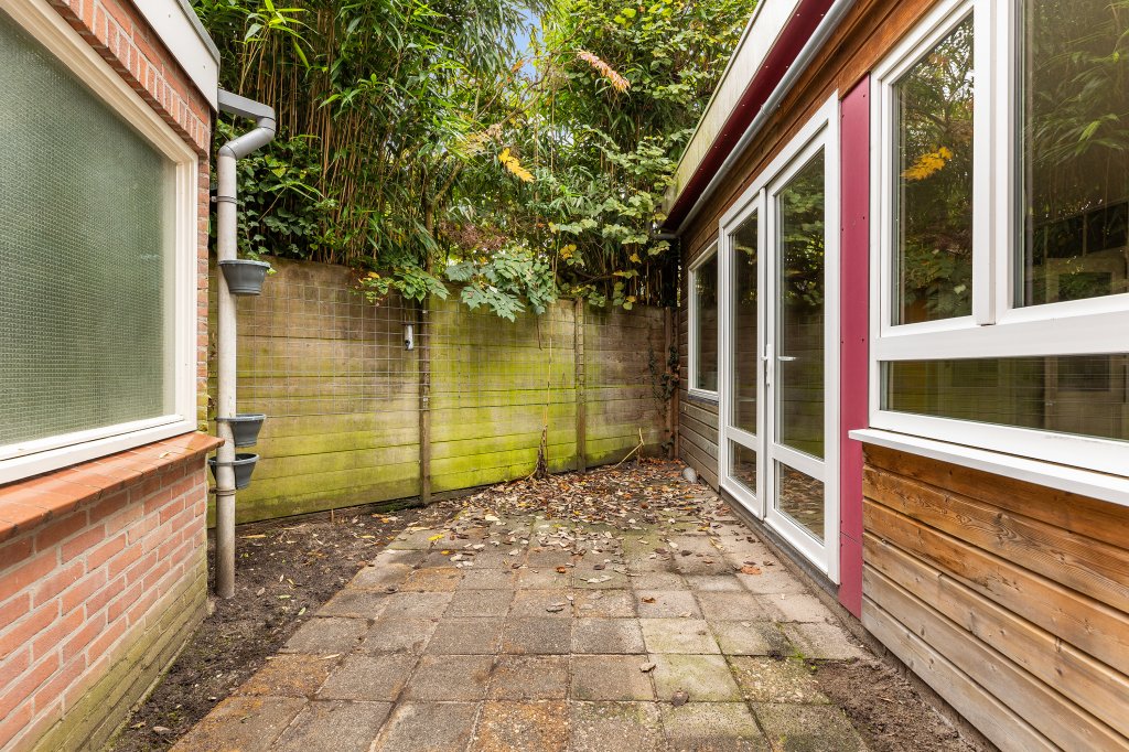 De woonkamer aan de achterzijde biedt een heerlijke verbinding met buiten: via de openslaande deuren bereik je een beschut stadstuintje, waar je in alle rust kunt genieten van een kop koffie of een gezellige borrel.