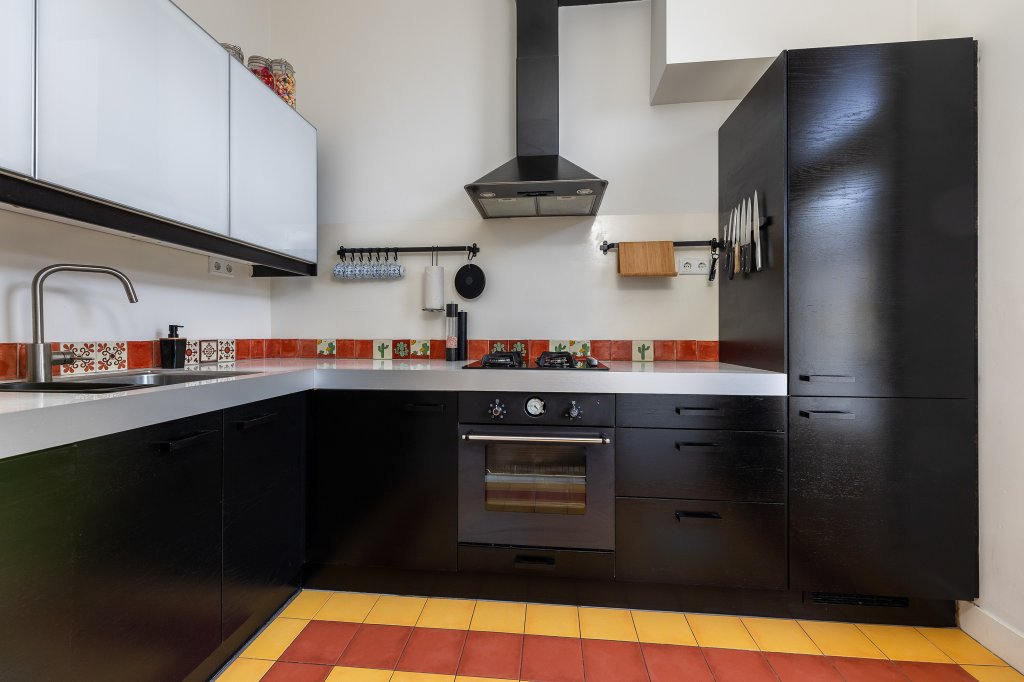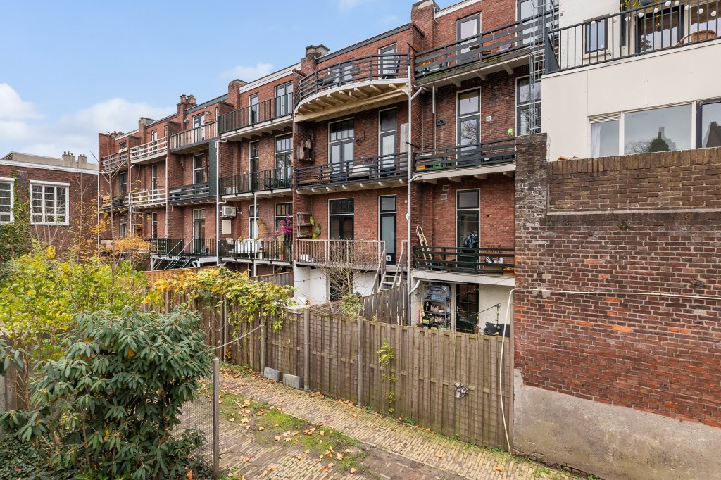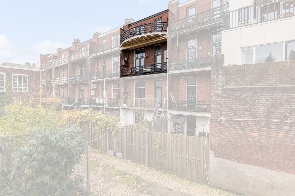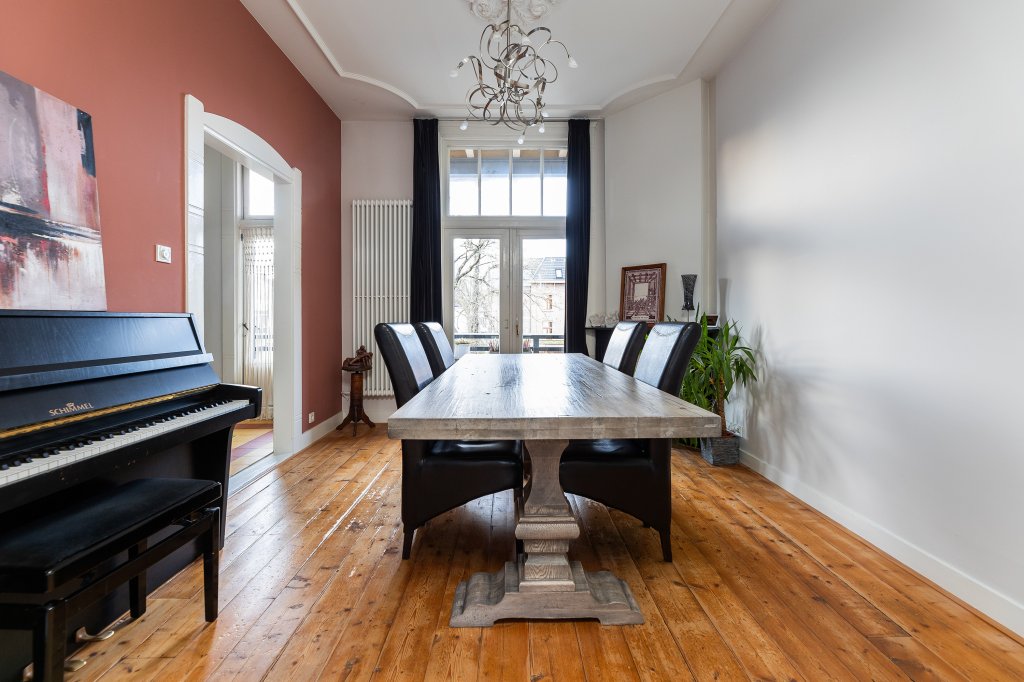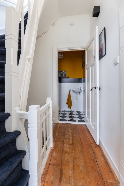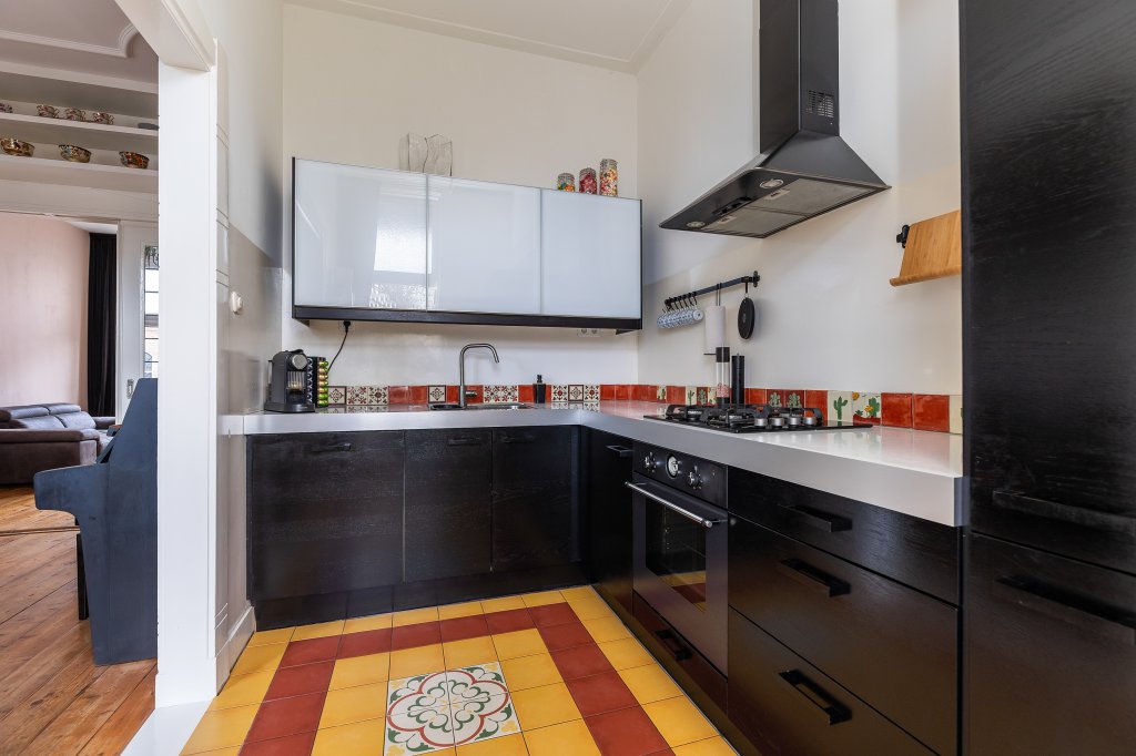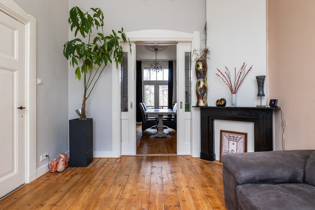 Via de statige trap kom je bij de voordeur en stap je de hal binnen, met de meterkast en de trapopgang naar de eerste verdieping. Daar vind je een toilet en een handig kamertje, perfect als berging of garderoberuimte. De woonkamer is verdeeld in een voor- en achterkamer, gescheiden door en suitedeuren met vaste kasten. Beide kamers hebben hun originele schouw en hoge plafonds, waardoor het geheel een rijke, bijna Parijse sfeer ademt. Aan de achterzijde ligt de keuken, voorzien van een vaatwasser, koel/vriescombinatie, gaskookplaat met afzuigkap en oven, die direct toegang biedt tot het eerste balkon – heerlijk gelegen op het westen.