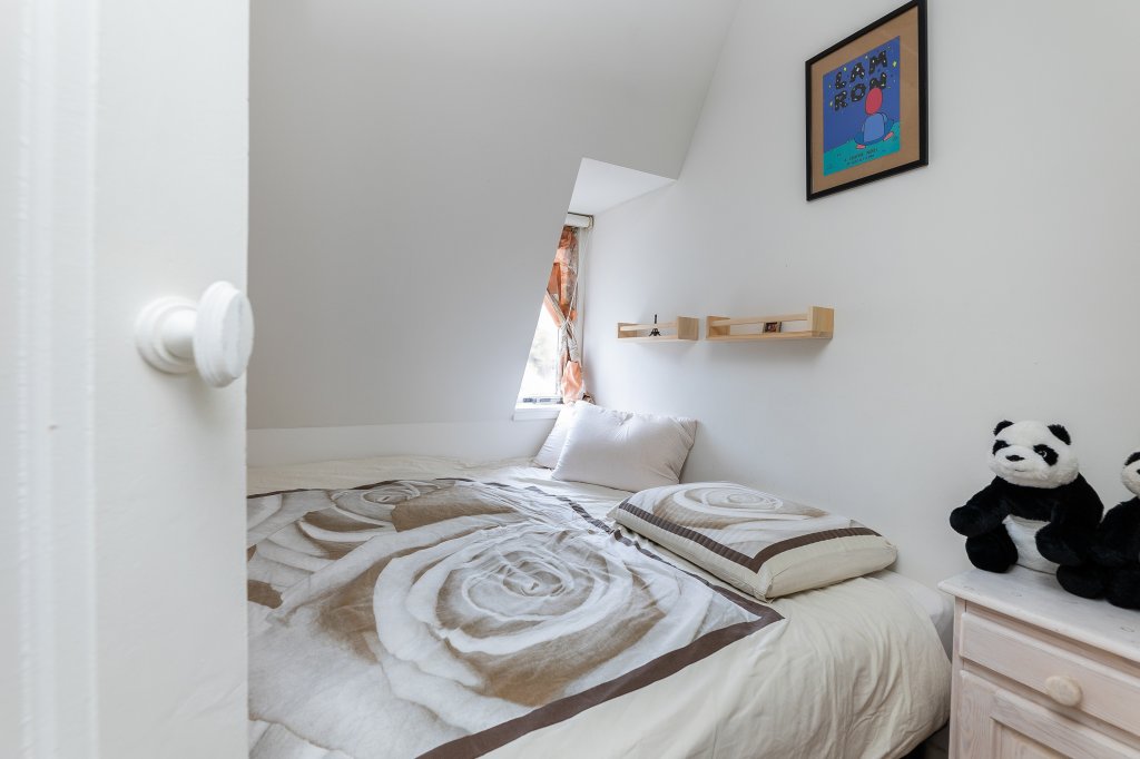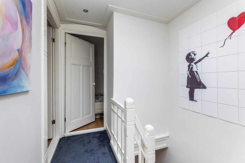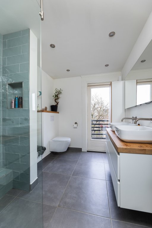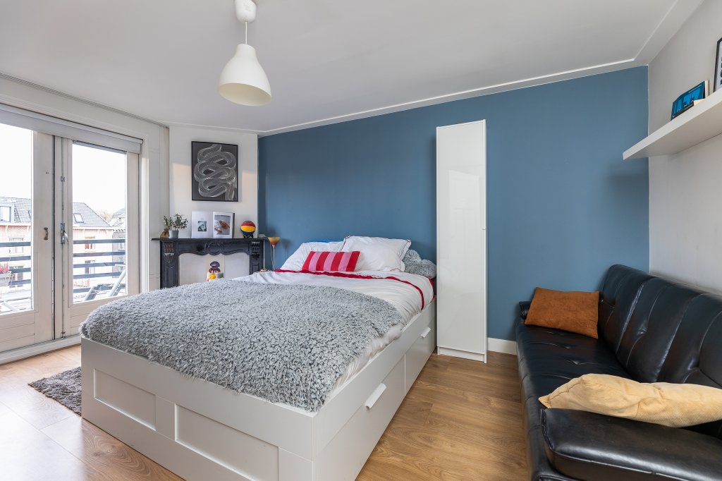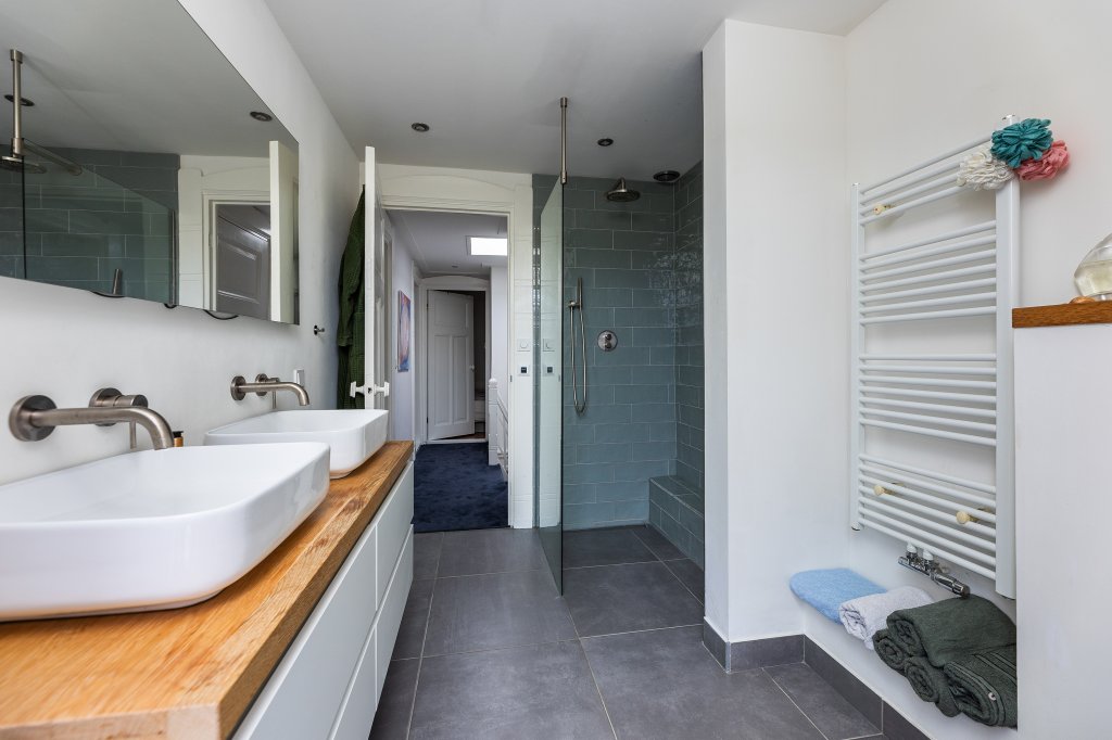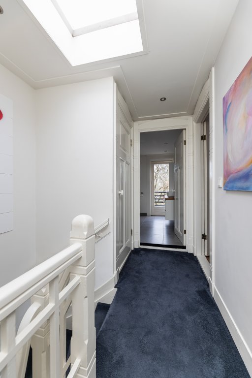 De bovenverdieping is verrassend ruim en licht. Via de overloop, met een dakkoepel die het daglicht binnenlaat, bereik je drie slaapkamers. De master bedroom aan de achterzijde heeft openslaande deuren naar het tweede, royale balkon – een zalige plek om de dag te beginnen of juist af te sluiten. De badkamer is modern en compleet, met dubbele wastafel, douche, toilet, vloerverwarming en designradiator.