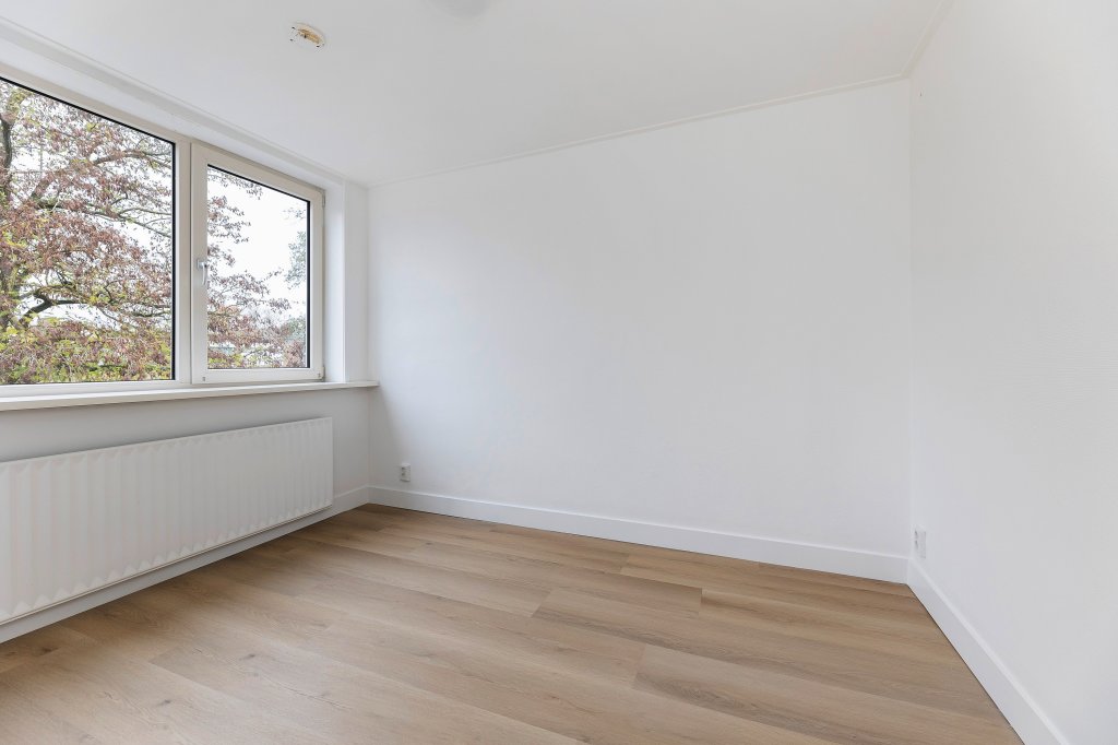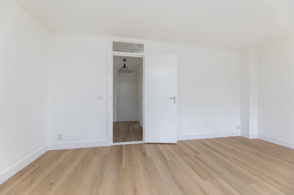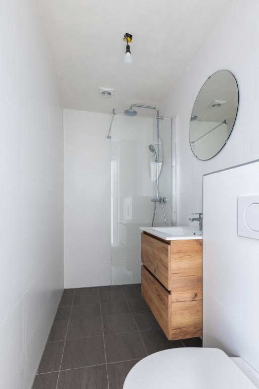 De ruime slaapkamer biedt voldoende plek voor een groot tweepersoonsbed én een royale kastenwand. De badkamer is recent vernieuwd en modern afgewerkt, voorzien van een inloopdouche, wastafelmeubel en een hangend toilet.