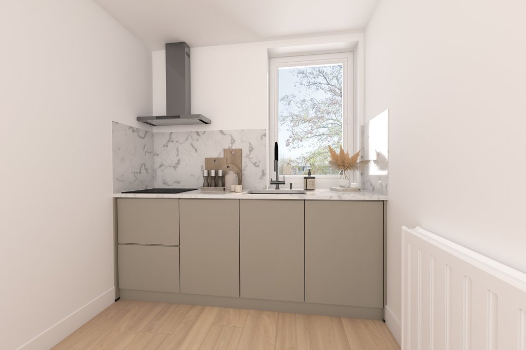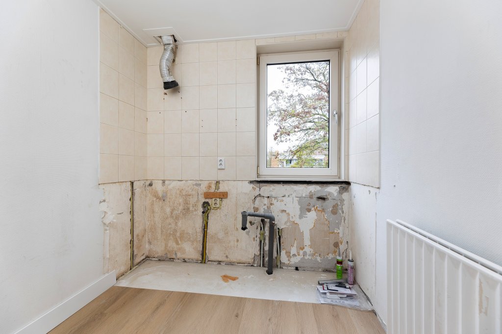 De keuken is afgesloten van de woonkamer en wordt momenteel volledig vernieuwd. Deze moderne keuken – die vóór de overdracht wordt geplaatst – wordt uitgerust met alle gewenste voorzieningen, waaronder een inductiekookplaat met afzuigkap, een koelkast met vriesvak, een vaatwasser en een combi-oven. Ook vind je hier de aansluitingen voor de wasmachine en droger, zodat alles praktisch en efficiënt is ingedeeld.