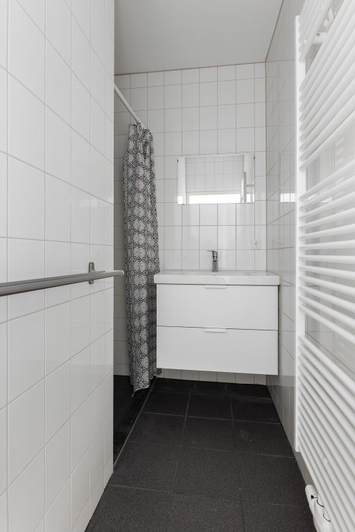 De badkamer is modern en praktisch ingedeeld met een inloopdouche, een wastafelmeubel en een designradiator. Het toilet bevindt zich apart van de badkamer, wat wel zo fijn is. De slaapkamer is ruim en biedt genoeg plek voor een tweepersoonsbed en een kast. Daarnaast is er nog een gedeelde berging aan de voorzijde beschikbaar voor extra opslag.